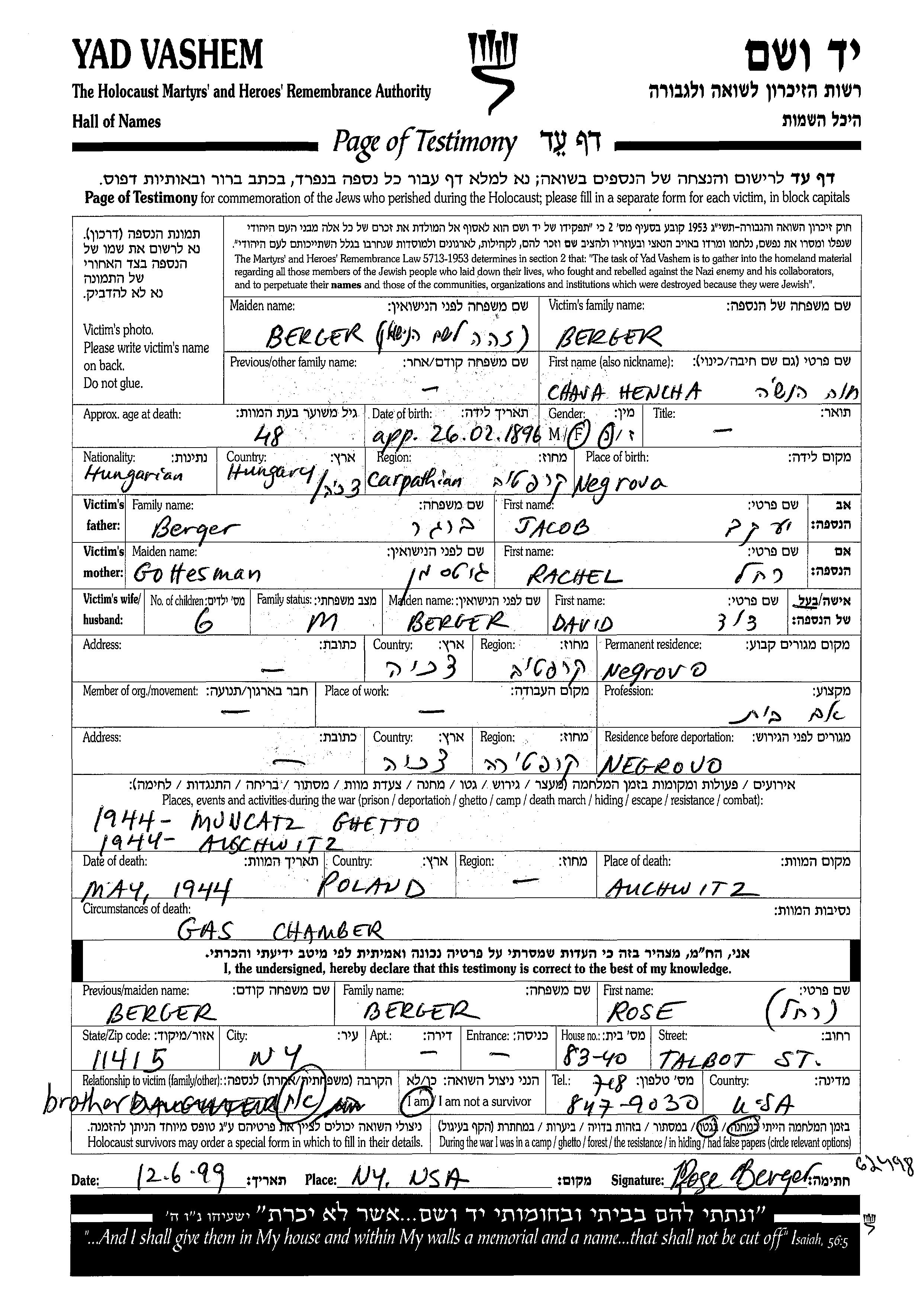 Helen Hencha Khava Berger, geb. Berger wurde im Jahr 1896 geboren. Vor dem Zweiten Weltkrieg lebte sie in Negrovo, Tschechoslowakei.
