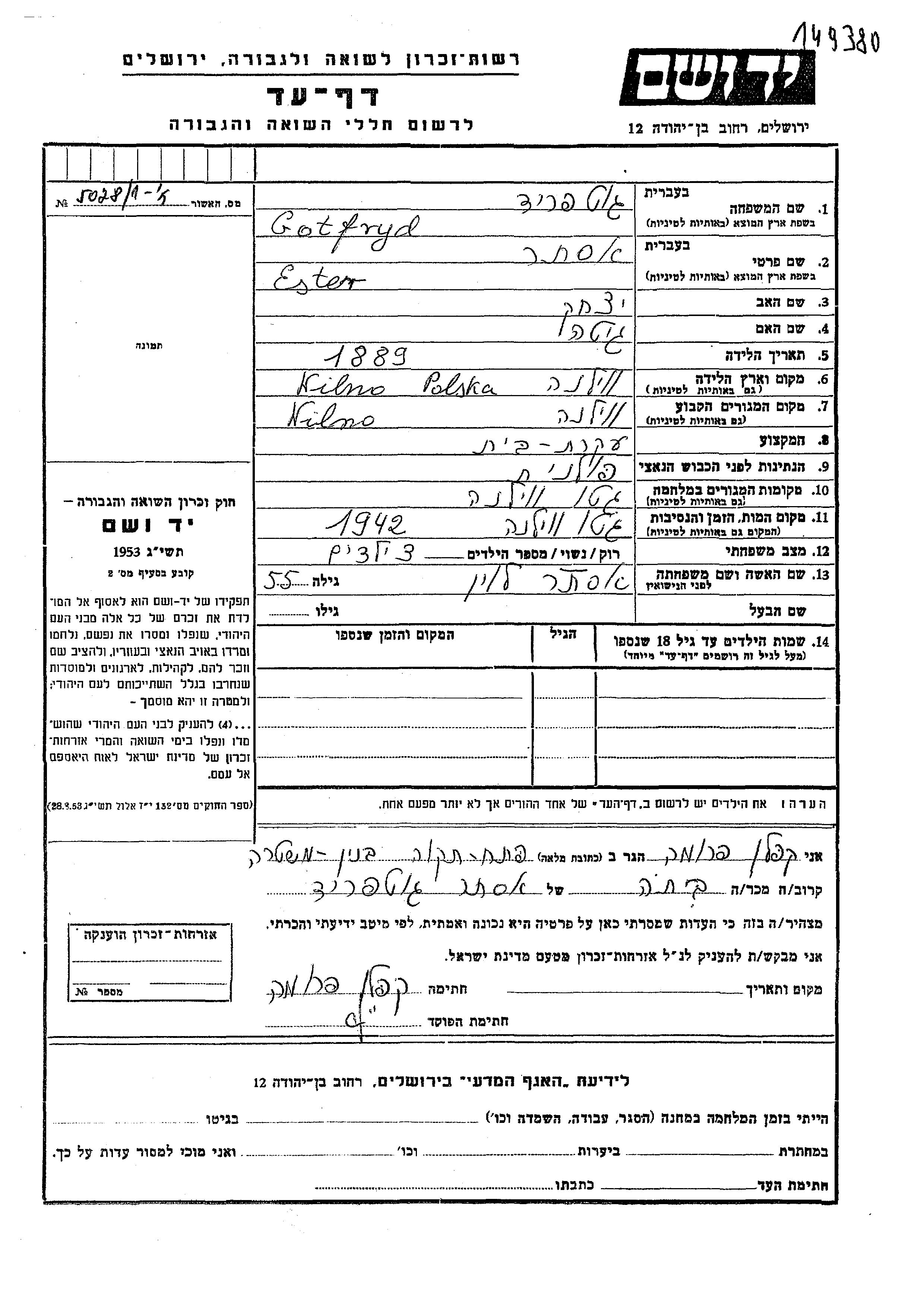 Ester Gotfryd, geb. Levin wurde im Jahr 1889 in Wilno, Polen geboren. Sie war die Tochter von Yitzkhak und Gita. Sie war Hausfrau und Verheiratet. Vor dem Zweiten Weltkrieg lebte sie in Wilno, Polen. Während des Krieges war sie in Wilno, Polen.