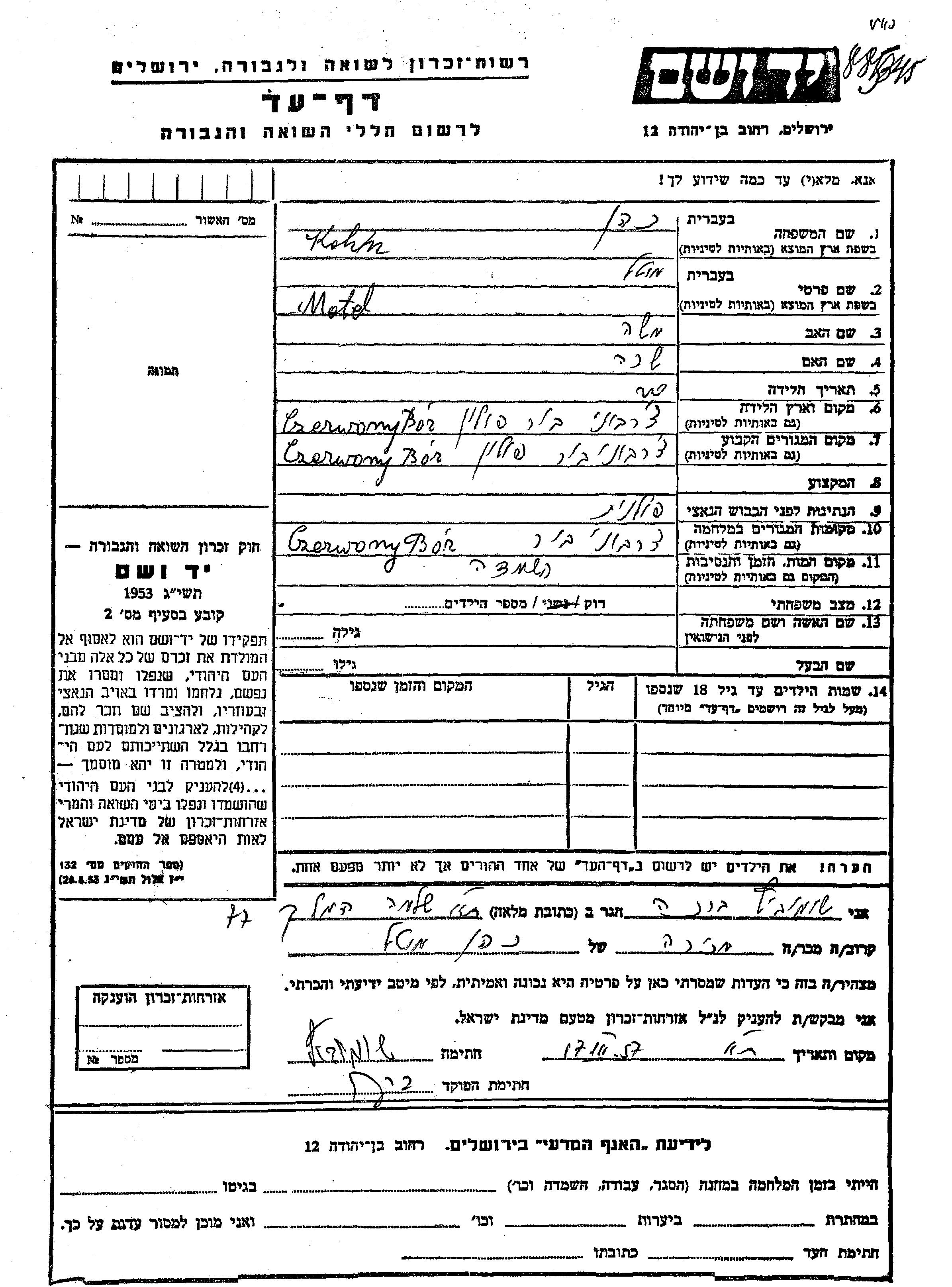 Motel Kohn wurde in Czerwony Bor, Polen geboren. Er war der Sohn von Moshe und Sara. Er war Ledig. Vor dem Zweiten Weltkrieg lebte er in Czerwony Bor, Polen. Während des Krieges war er in Czerwony Bor, Polen.