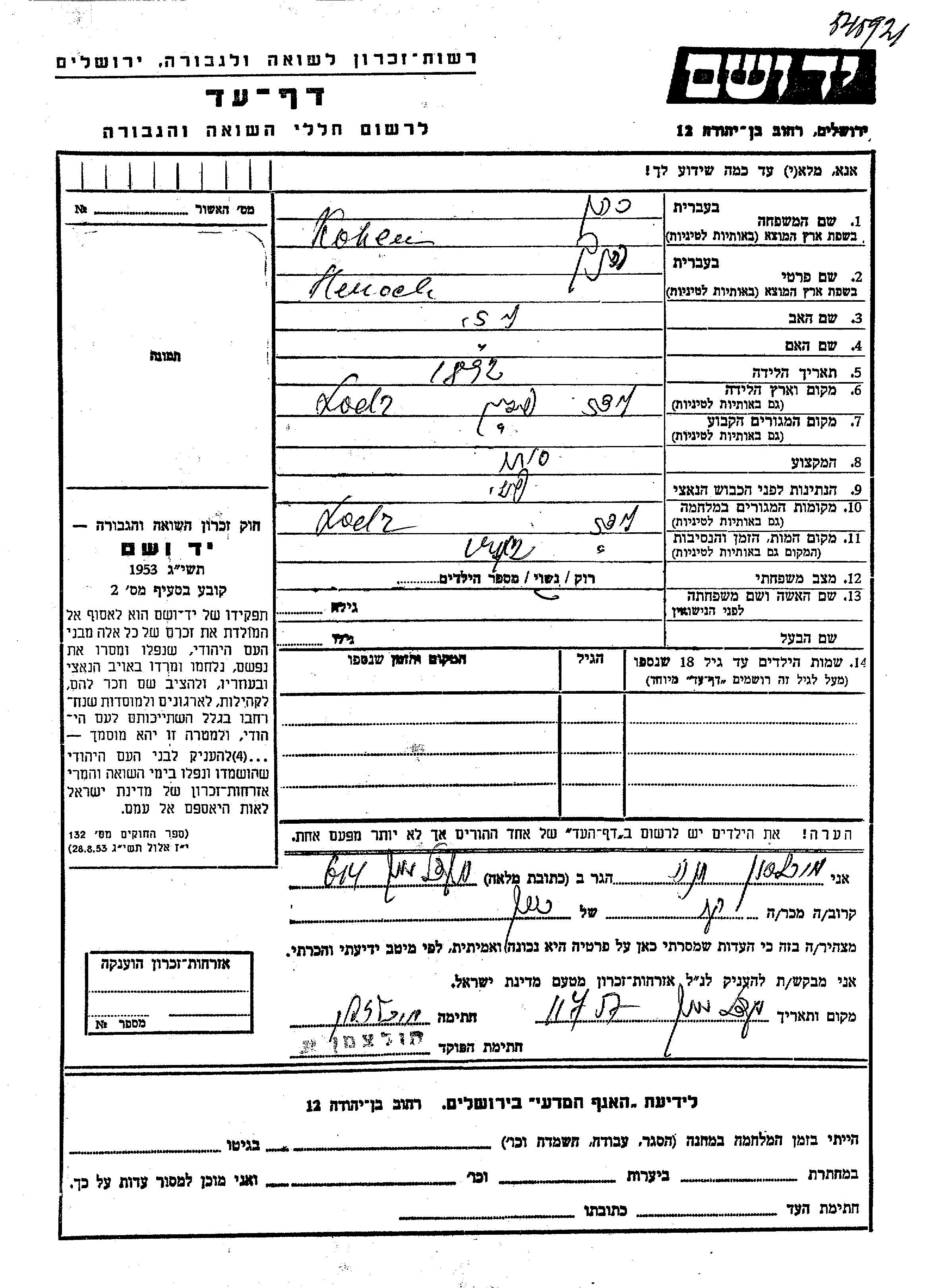Khanokh Kohen wurde im Jahr 1892 in Lodz, Polen geboren. Er war Kaufmann/-frau und Verheiratet. Vor dem Zweiten Weltkrieg lebte er in Lodz, Polen. Während des Krieges war er in Lodz, Polen.