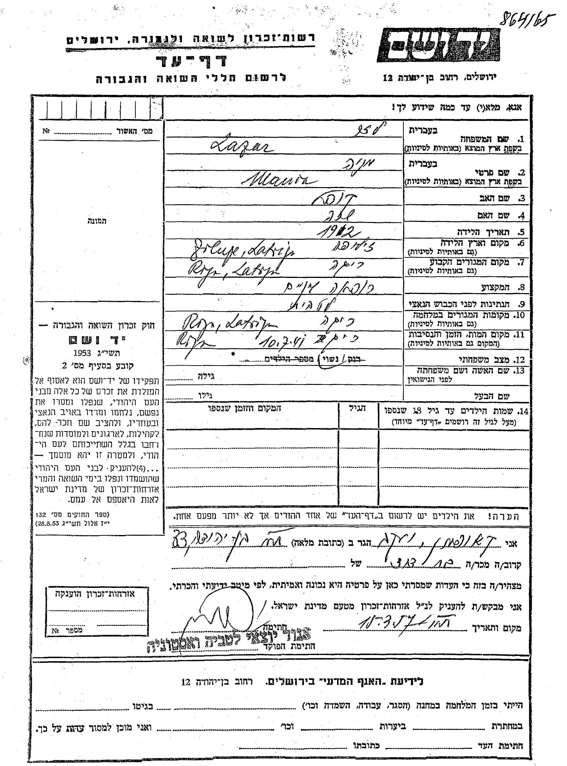 Mania Lazar wurde im Jahr 1912 in Zilupe, Lettland geboren. Sie war die Tochter von Kopel und Sara. Sie war Zahnarzt/-ärztin und Verheiratet. Vor dem Zweiten Weltkrieg lebte sie in Riga, Lettland. Während des Krieges war sie in Riga, Lettland.