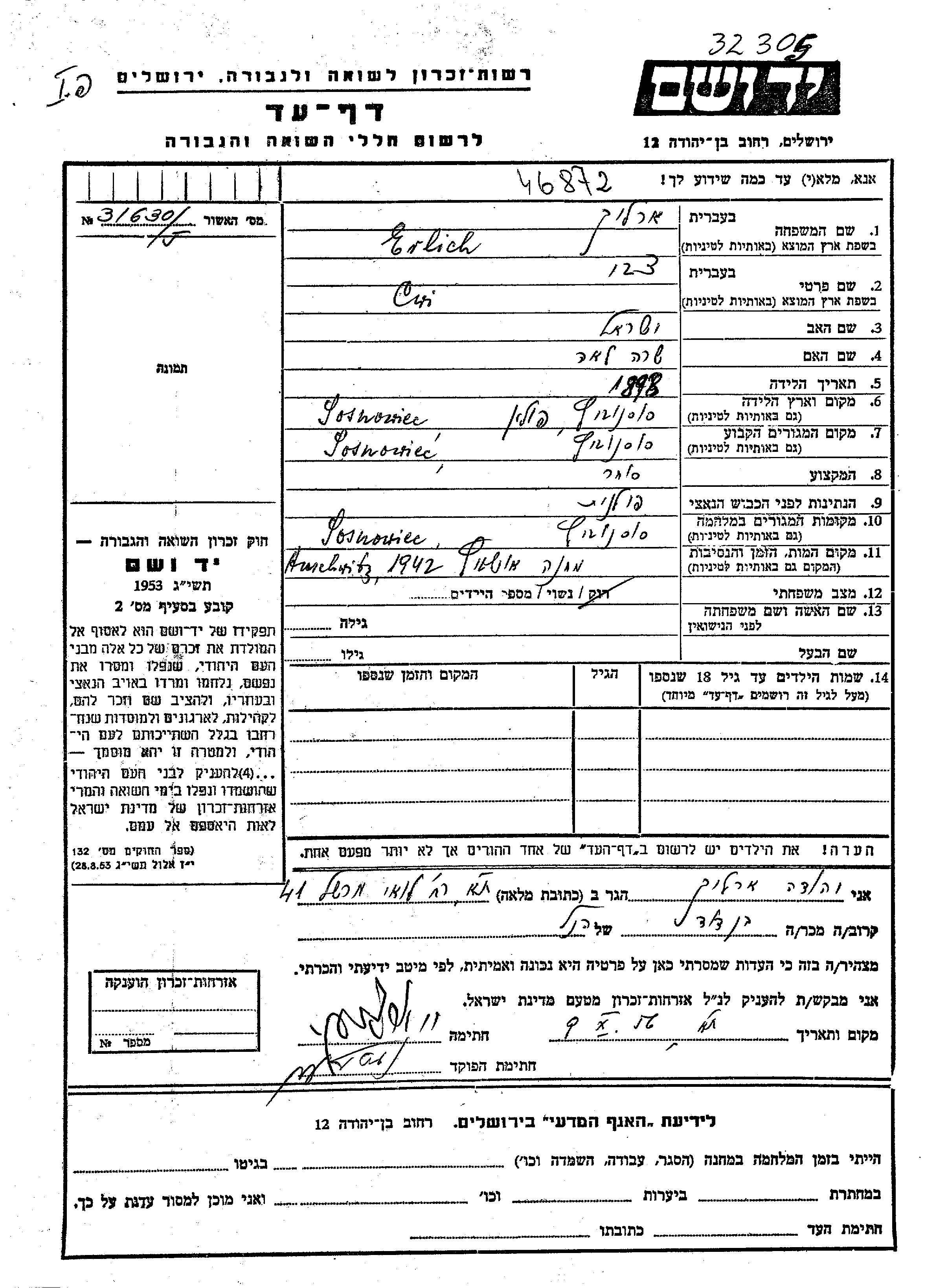 Cwi Erlich wurde im Jahr 1898 in Sosnowiec, Polen geboren. Er war der Sohn von Yisrael und Sara Lea. Er war Kaufmann/-frau und Verheiratet. Vor dem Zweiten Weltkrieg lebte er in Sosnowiec, Polen. Während des Krieges war er in Sosnowiec, Polen.