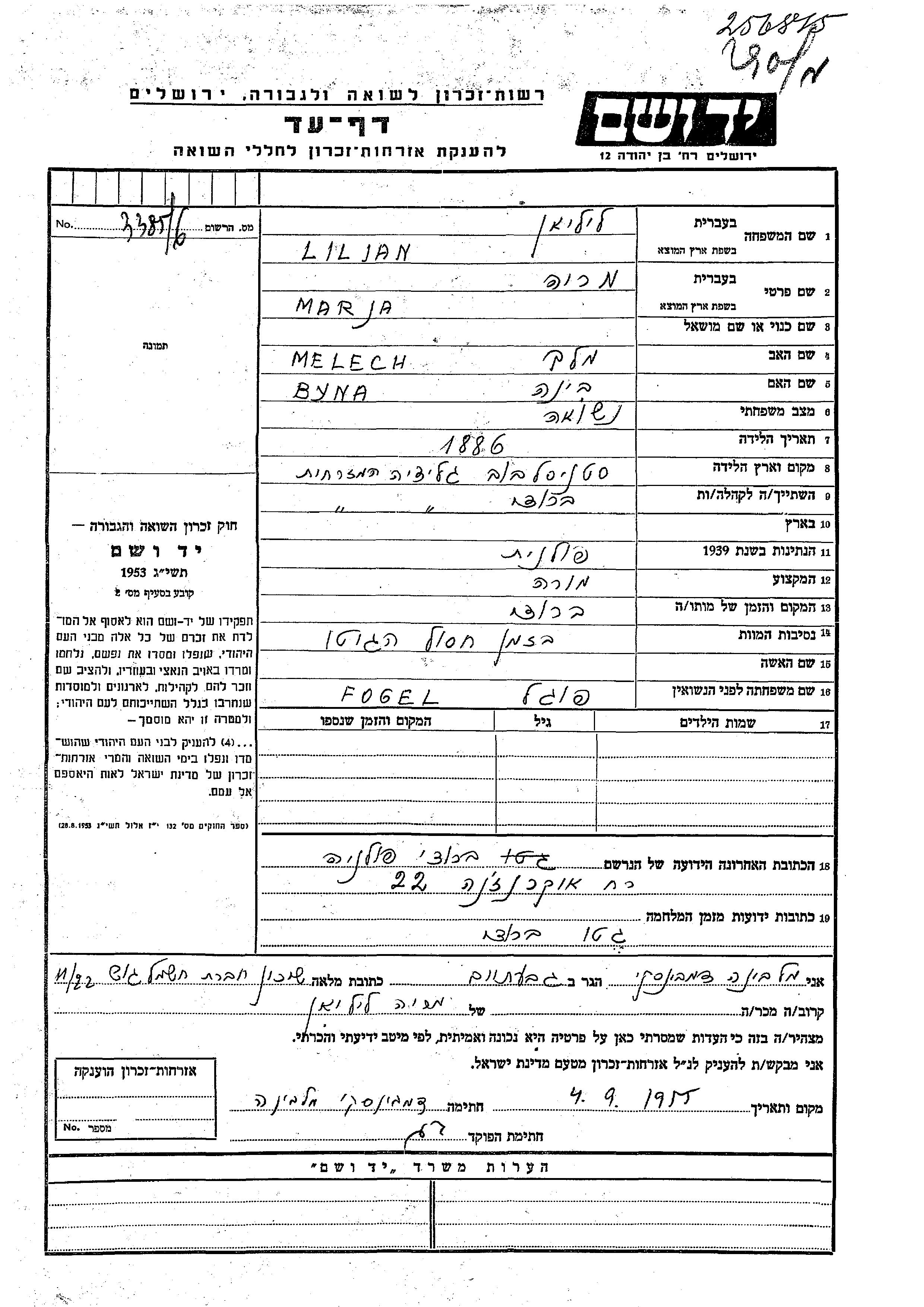 Marja Liljan wurde im Jahr 1886 in Stanislawow, Polen geboren. Sie war die Tochter von Melech und Byna. Sie war Lehrer/in und Verheiratet. Vor dem Zweiten Weltkrieg lebte sie in Brody, Polen. Während des Krieges war sie in Brody, Polen.