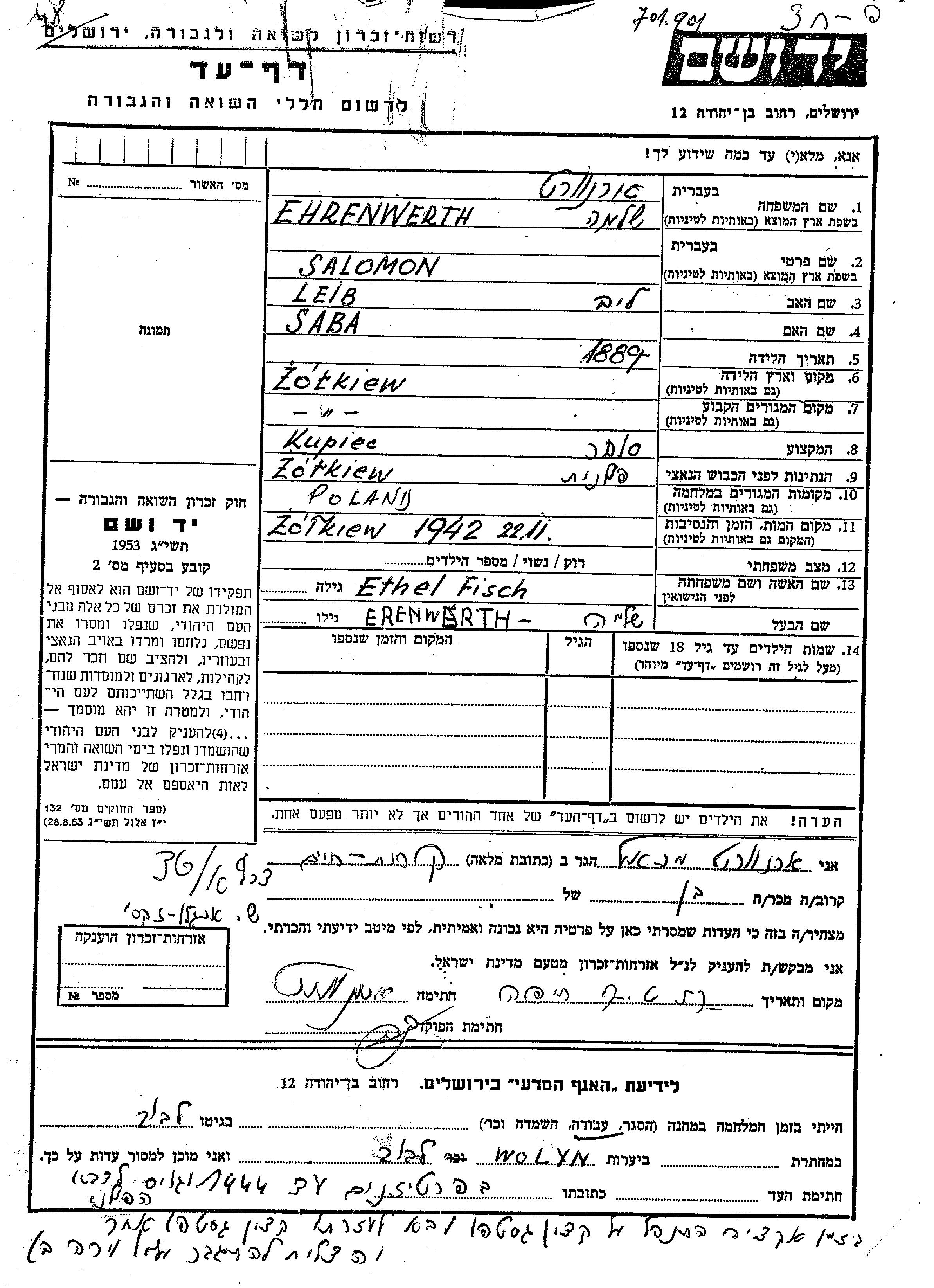 Salomon Ehrenwerth wurde im Jahr 1889 in Zolkiew, Polen geboren. Er war der Sohn von Leib und Sava. Er war Kaufmann/-frau und mit Ethel, geb. Fisch Verheiratet. Vor dem Zweiten Weltkrieg lebte er in Zolkiew, Polen. Während des Krieges war er in Zolkiew, Polen.