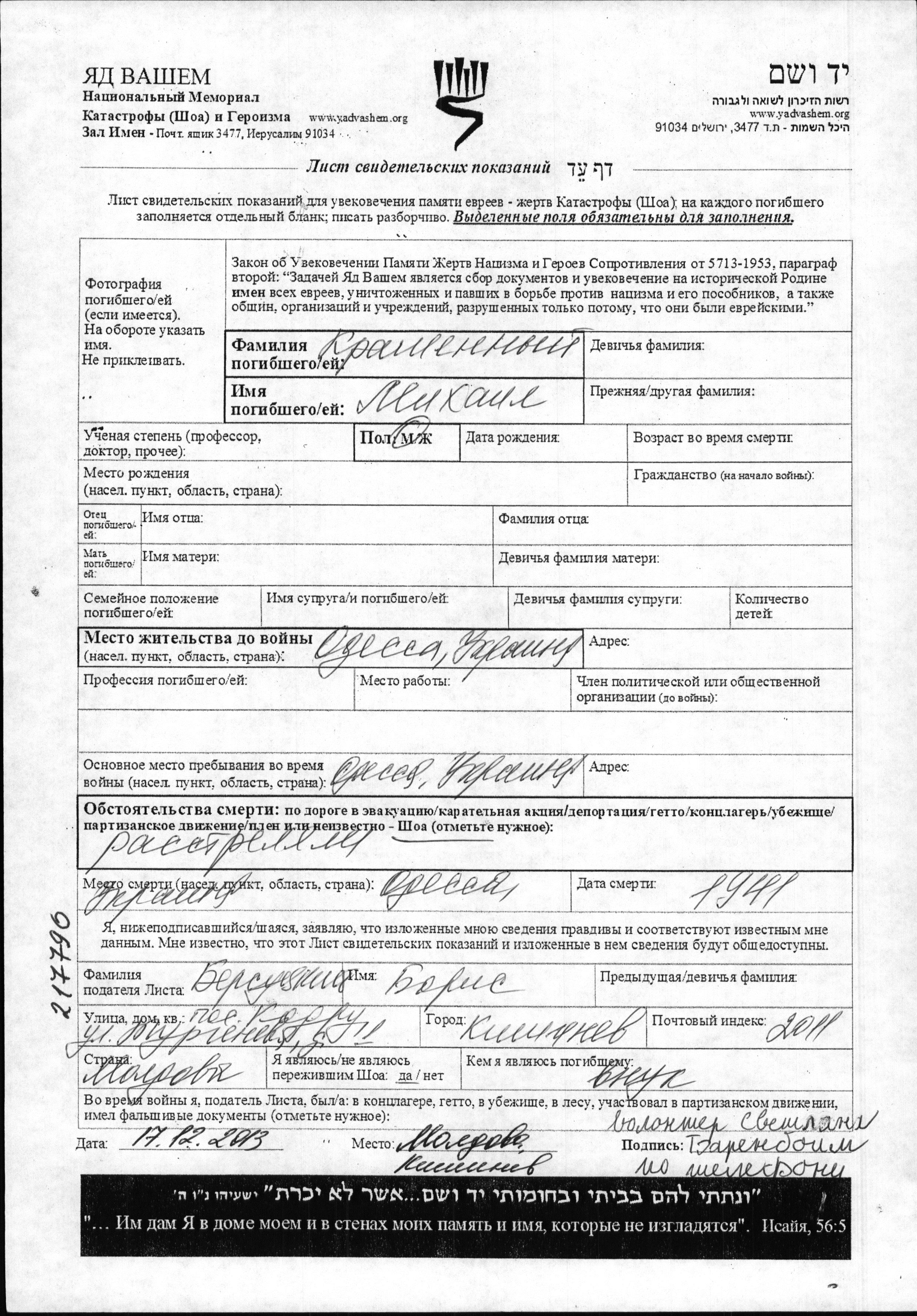 Mikhail wurde in der Schoah ermordet. Todesort: Odessa, Ukraine (UdSSR) im Jahr 1941.