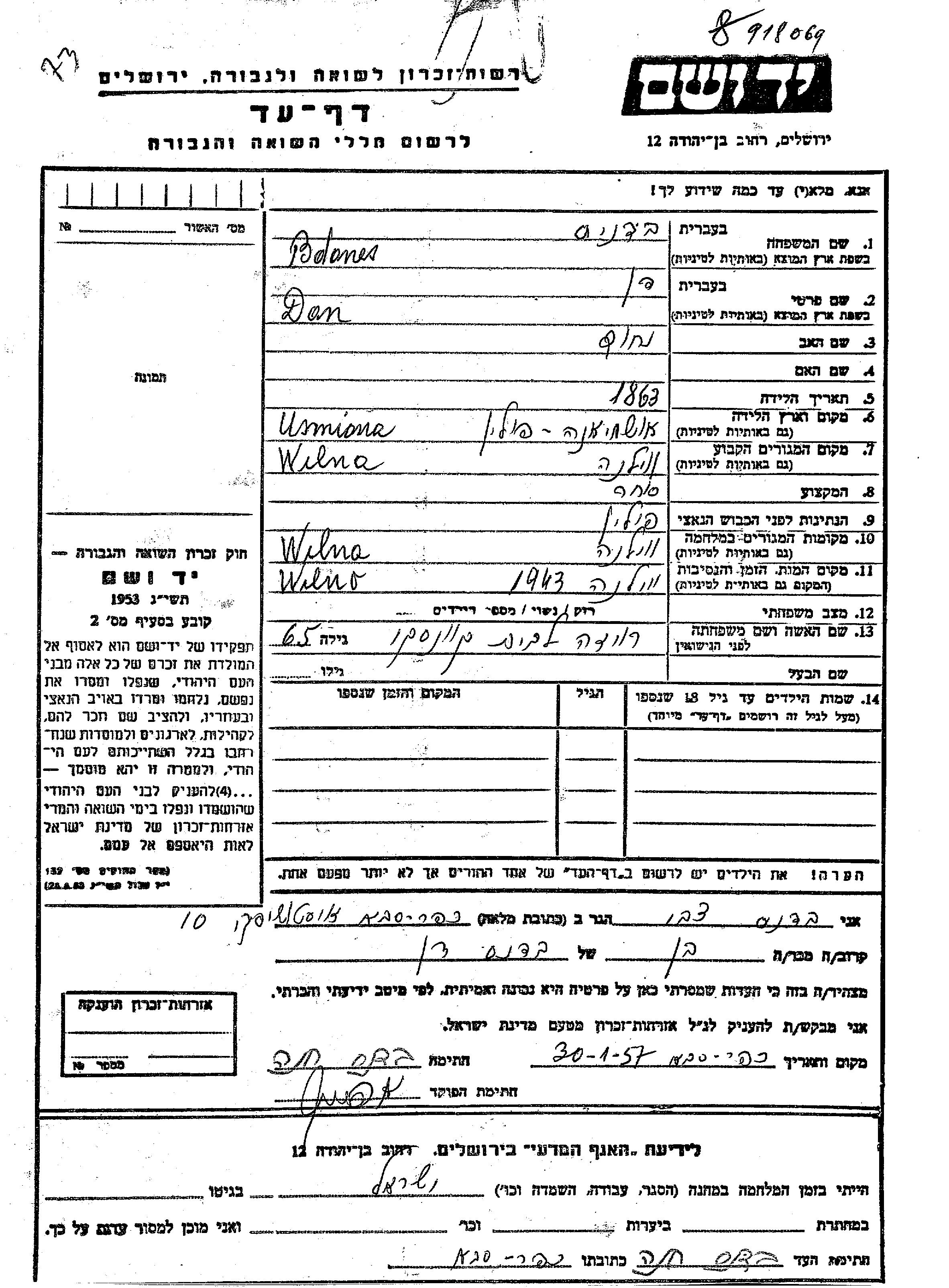 Dan wurde in der Schoah ermordet. Todesort: Wilna, Polen im Jahr 1943.