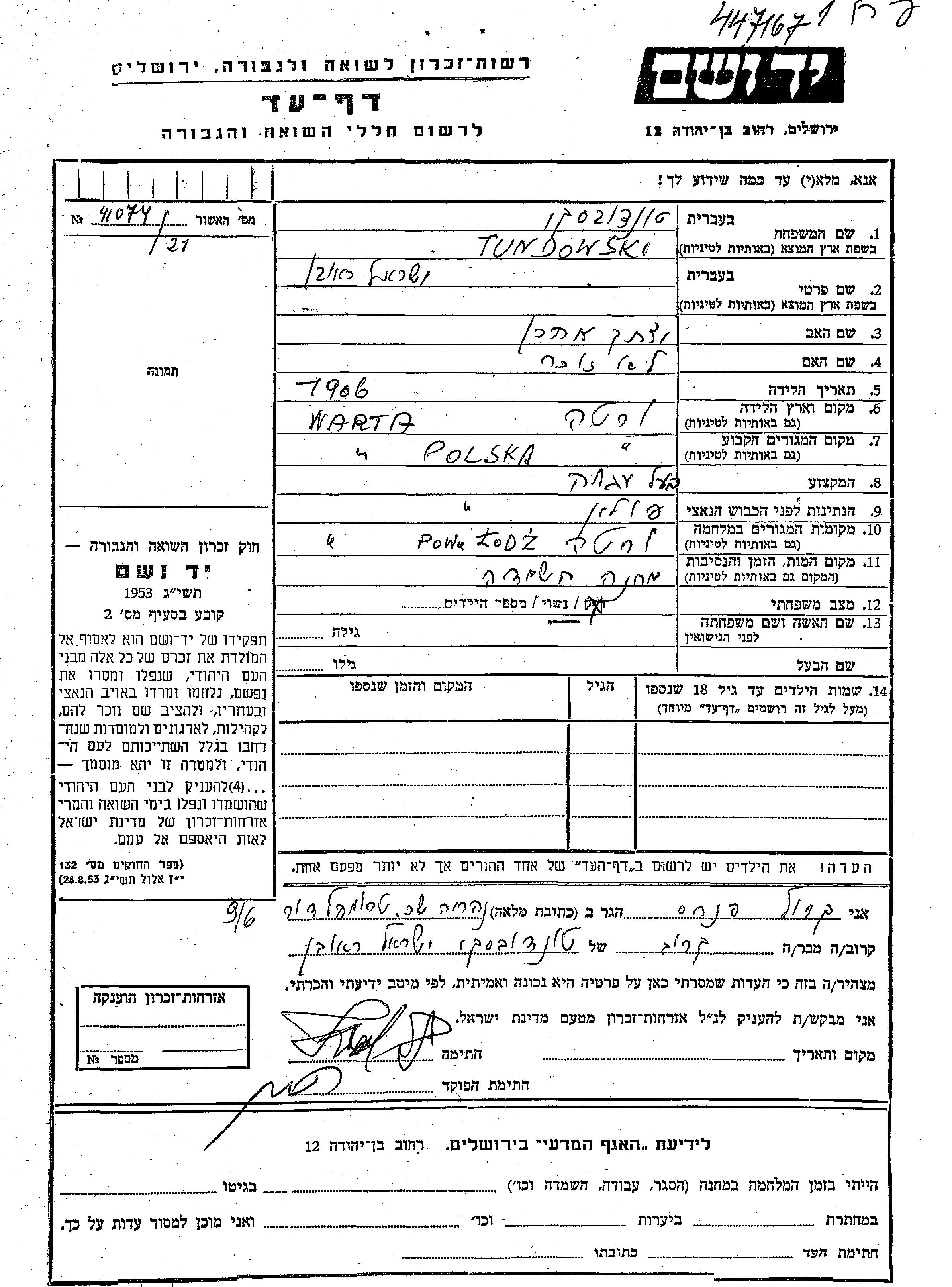Yisrael Reuven Tundowski wurde im Jahr 1906 in Warta, Polen geboren. Er war der Sohn von Yitzkhak Aharon. Er war Fuhrmann und Verheiratet. Vor dem Zweiten Weltkrieg lebte er in Warta, Polen. Während des Krieges war er in Warta, Polen.