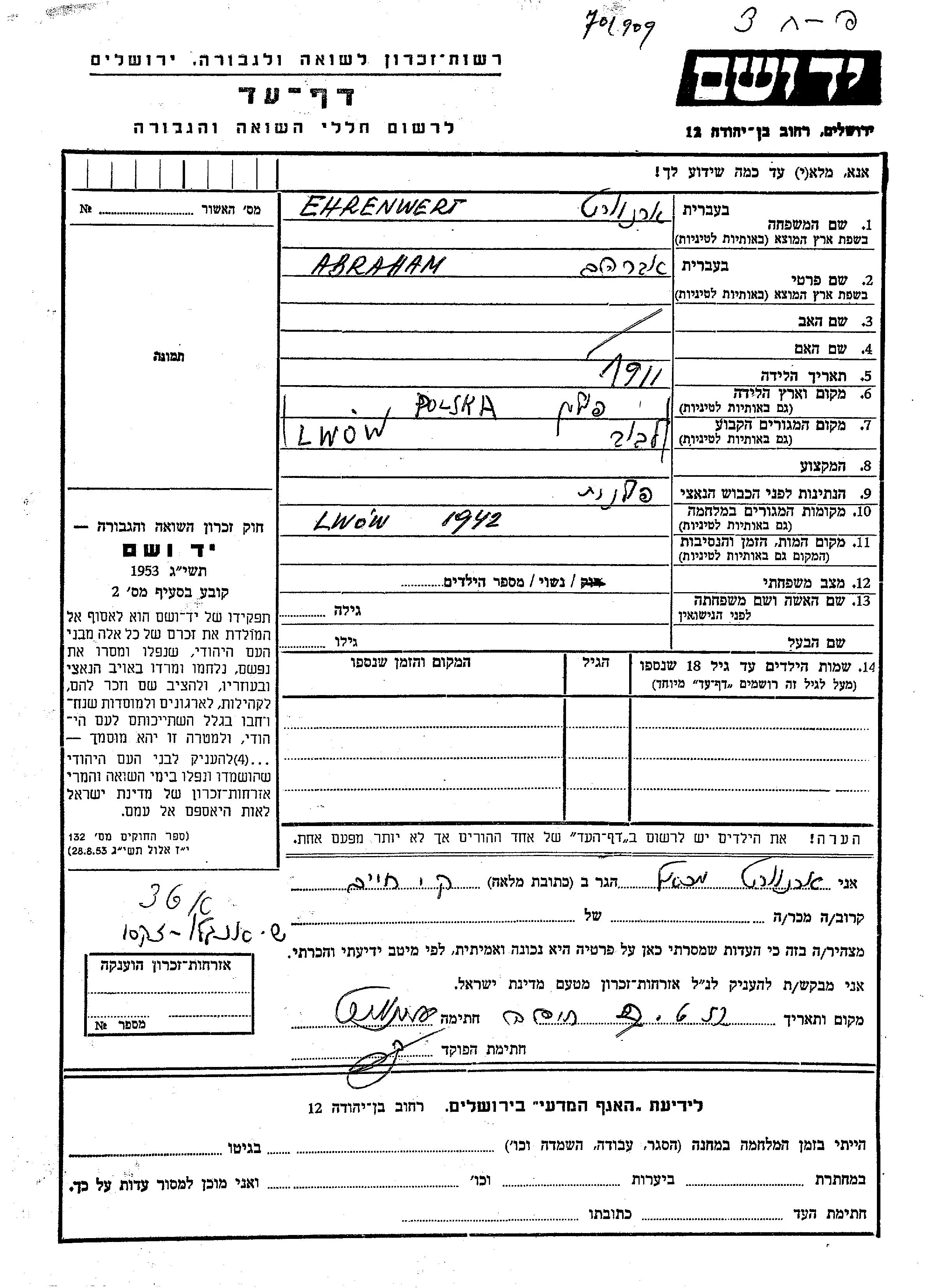 Abraham Ehrenwert wurde im Jahr 1911 in Lwow, Polen geboren. Er war Verheiratet. Vor dem Zweiten Weltkrieg lebte er in Lwow, Polen. Während des Krieges war er in Lwow, Polen.