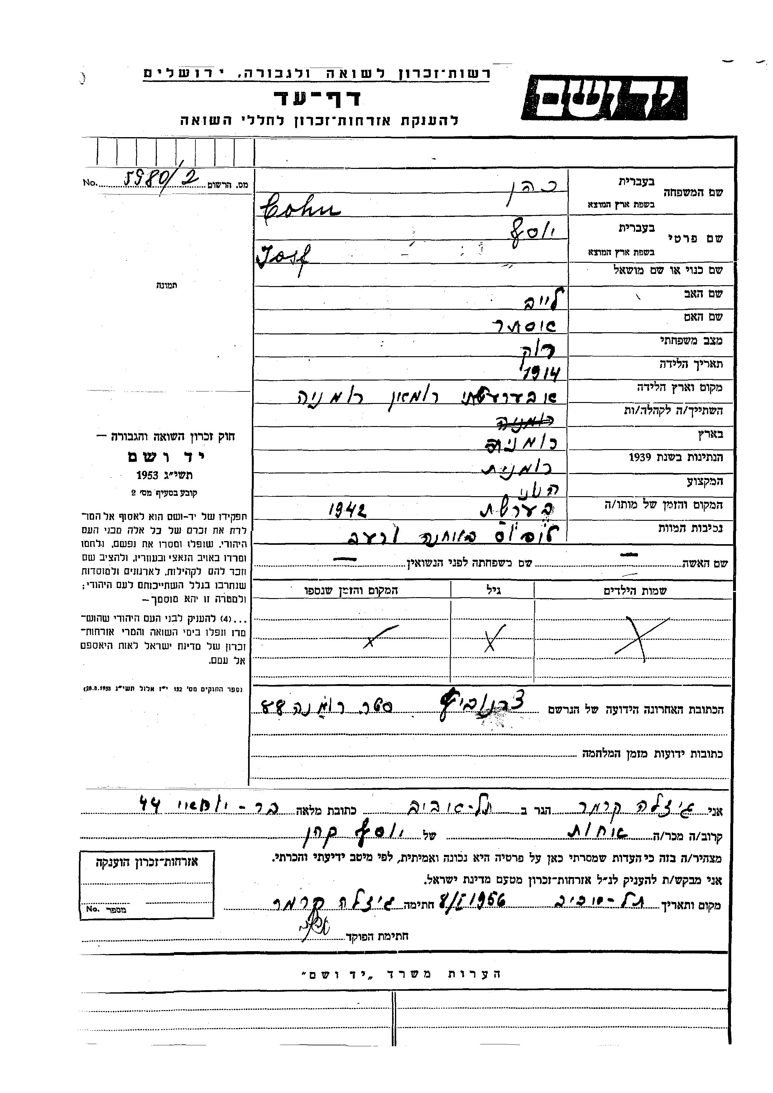 Josf Cohn wurde im Jahr 1914 in Averesti, Rumänien geboren. Er war der Sohn von Leib und Ester. Er war Lebensmittelhändler/-in und Ledig. Vor dem Zweiten Weltkrieg lebte er in Cernauti, Rumänien.