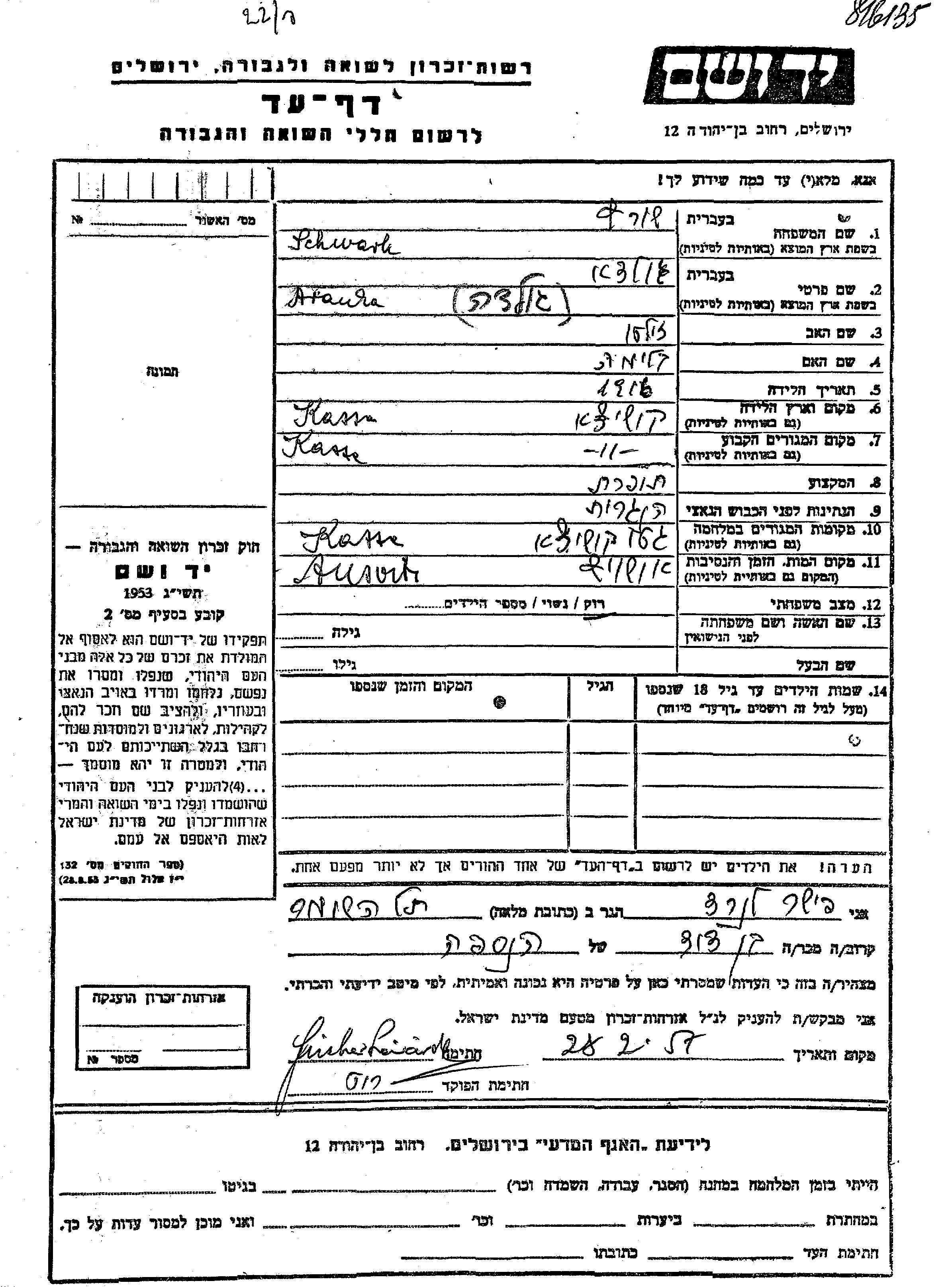 Golda Aranka Schwartc wurde im Jahr 1916 in Kosice, Tschechoslowakei geboren. Sie war die Tochter von Zoltan und Bluma. Sie war Schneiderin und Ledig. Vor dem Zweiten Weltkrieg lebte sie in Kosice, Tschechoslowakei. Während des Krieges war sie in Kosice, Tschechoslowakei.