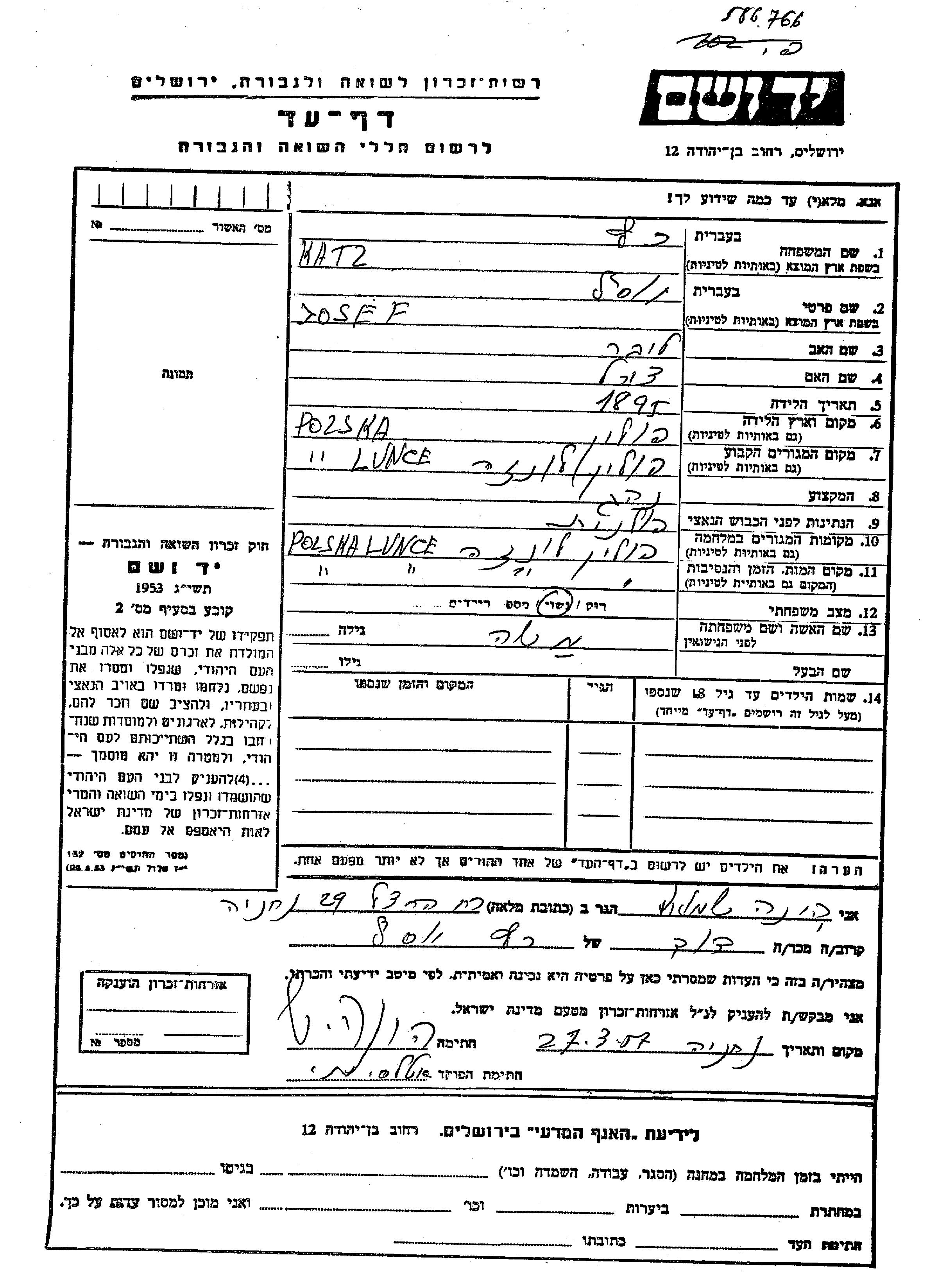Josef Katz wurde im Jahr 1895 in Polen geboren. Er war der Sohn von Liber und Tzirel. Er war Chauffeur und mit Masha Verheiratet. Vor dem Zweiten Weltkrieg lebte er in Lunce, Polen. Während des Krieges war er in Lunce, Polen.
