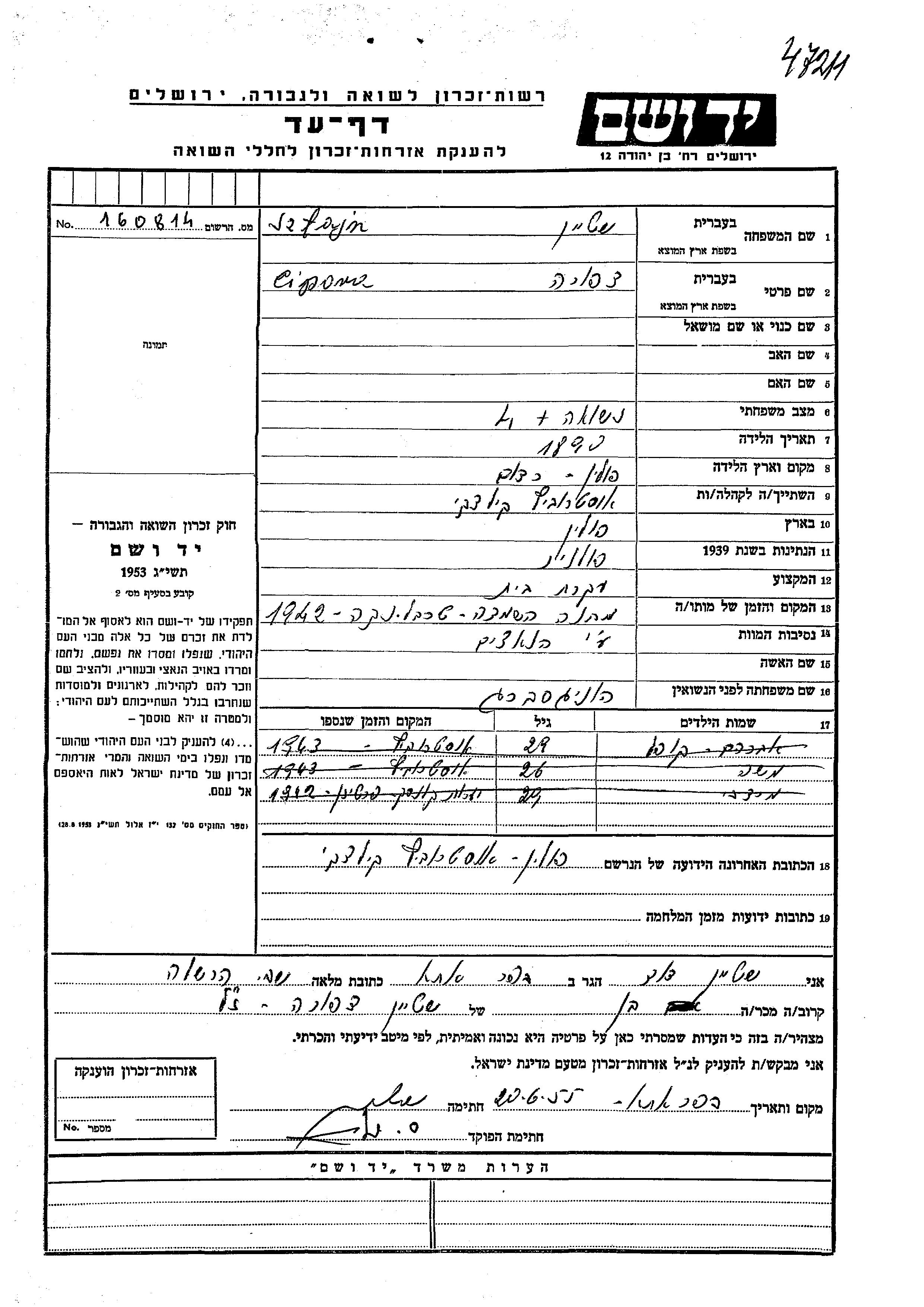 Cipora Sztajn, geb. Honigsberg wurde im Jahr 1890 in Radom, Polen geboren. Sie war Hausfrau und Verheiratet. Vor dem Zweiten Weltkrieg lebte sie in Ostrovic, Polen. Während des Krieges war sie in Ostrovic, Polen.