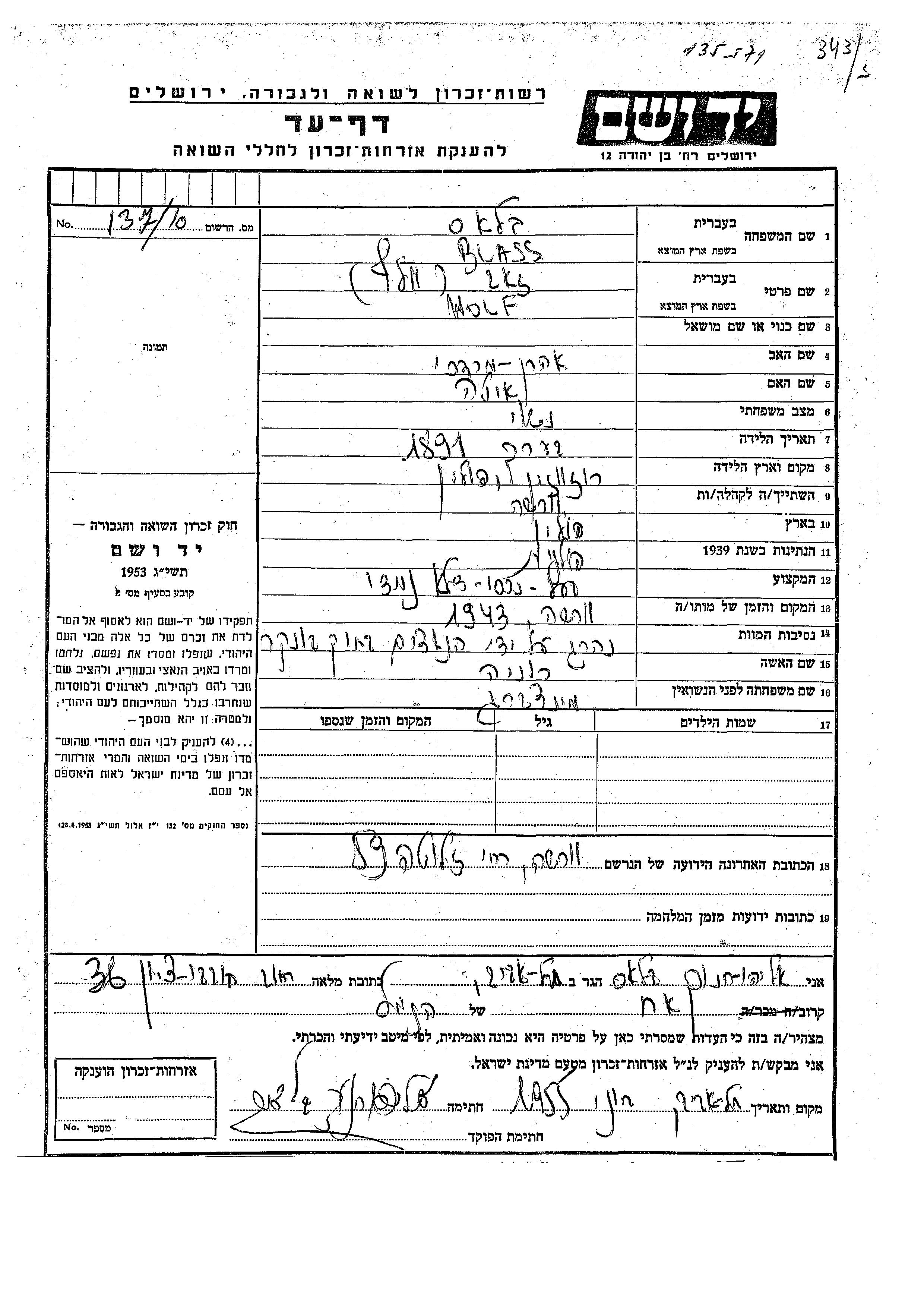 Wolf Zeev Blass wurde im Jahr 1891 in Rozwozin, Polen geboren. Er war der Sohn von Aharon Mordekhai und Ita. Er war Immobilienbesitzer/in. Vor dem Zweiten Weltkrieg lebte er in Warszawa, Polen. Während des Krieges war er in Warszawa, Polen.