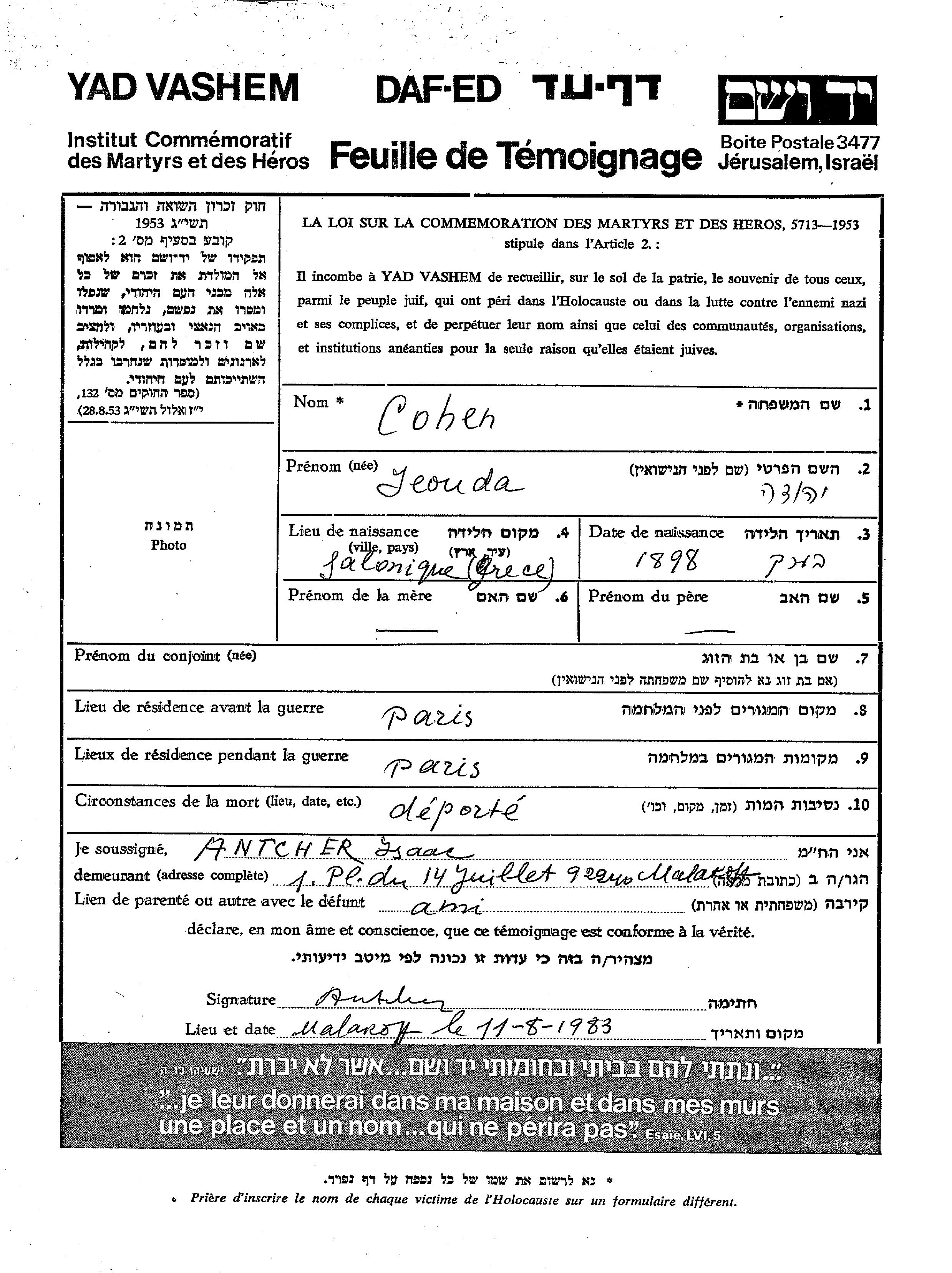 Yeouda Cohen wurde im Jahr 1898 in Saloniki, Griechenland geboren. Vor dem Zweiten Weltkrieg lebte er in Paris, Frankreich. Während des Krieges war er in Paris, Frankreich.