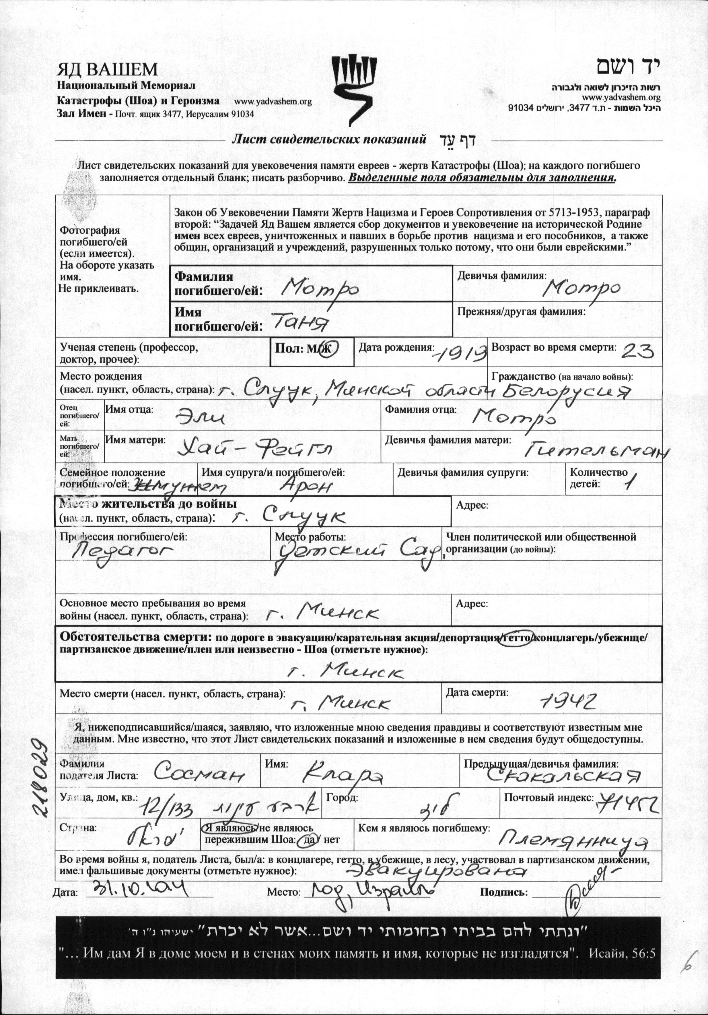 Tanya Motro wurde im Jahr 1919 in Slutsk, Weißrussland (UdSSR) geboren. Sie war die Tochter von Eli und Khay Feygl, geb. Gitelman. Sie war Kindergärtnerin und mit Aron Verheiratet. Vor dem Zweiten Weltkrieg lebte sie in Slutsk, Weißrussland (UdSSR). Während des Krieges war sie in Minsk, Weißrussland (UdSSR).