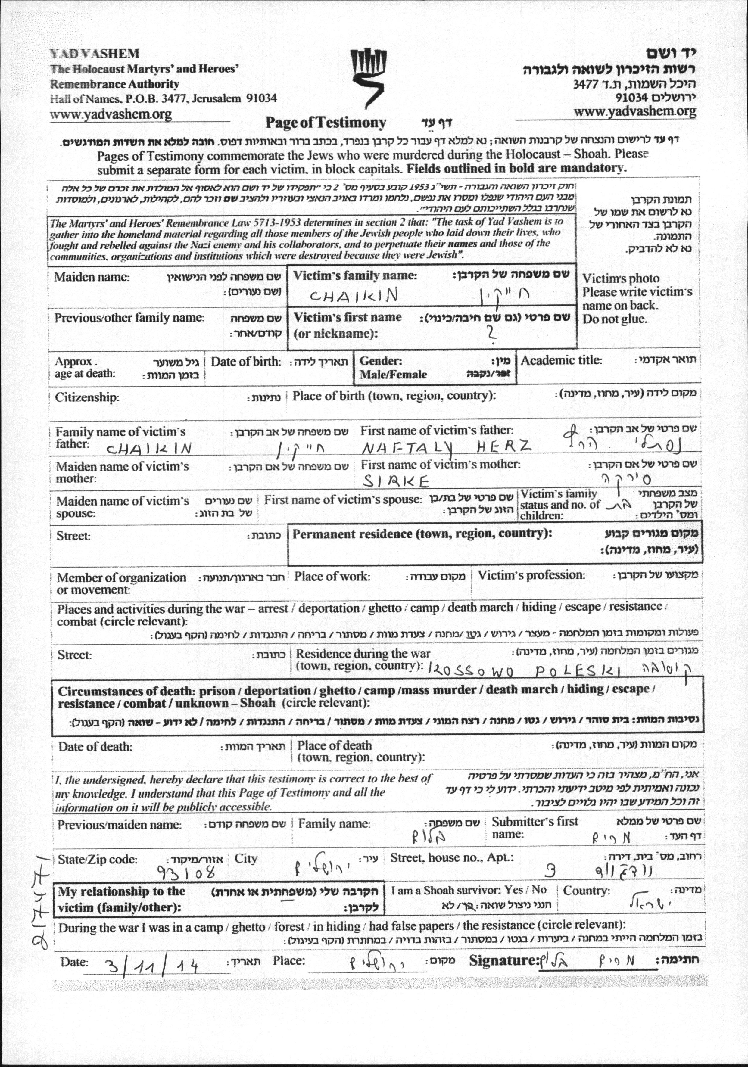 Vorname unbekannt Chaikin wurde Sie war die Tochter von Naftali Herz. Während des Krieges war sie in Kosow Poleski, Polen. Sie wurde in der Schoah ermordet.