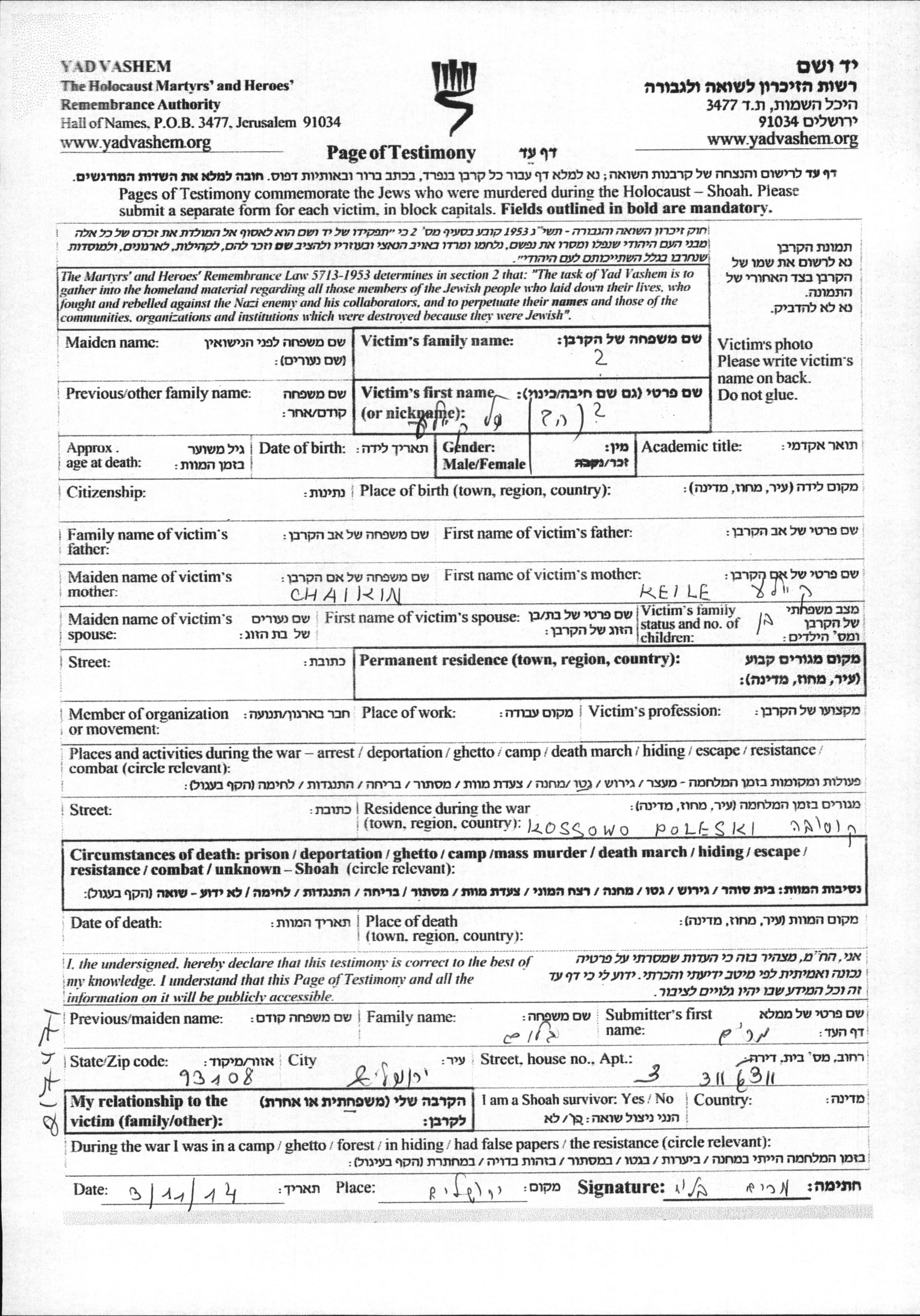 Vorname unbekannt Name unbekannt wurde Er war der Sohn von Keile, geb. Chaikin. Während des Krieges war er in Kosow Poleski, Polen. Er wurde in der Schoah ermordet.