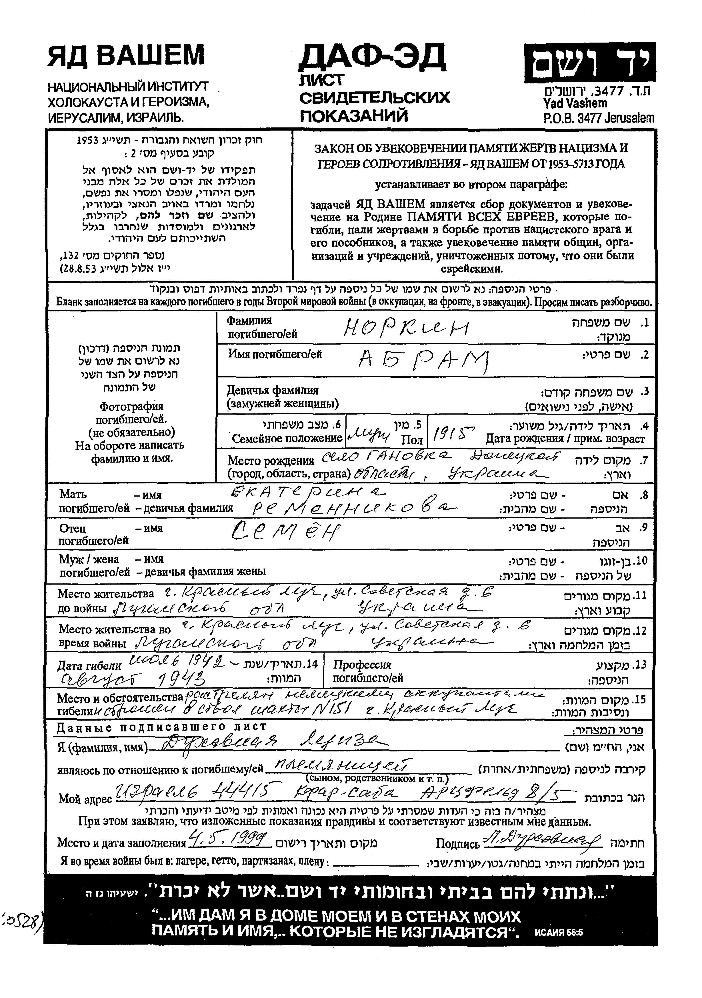 Norkin Abram 1915 Krasny Luch, Ukraine (UdSSR) Gedenkblatt
