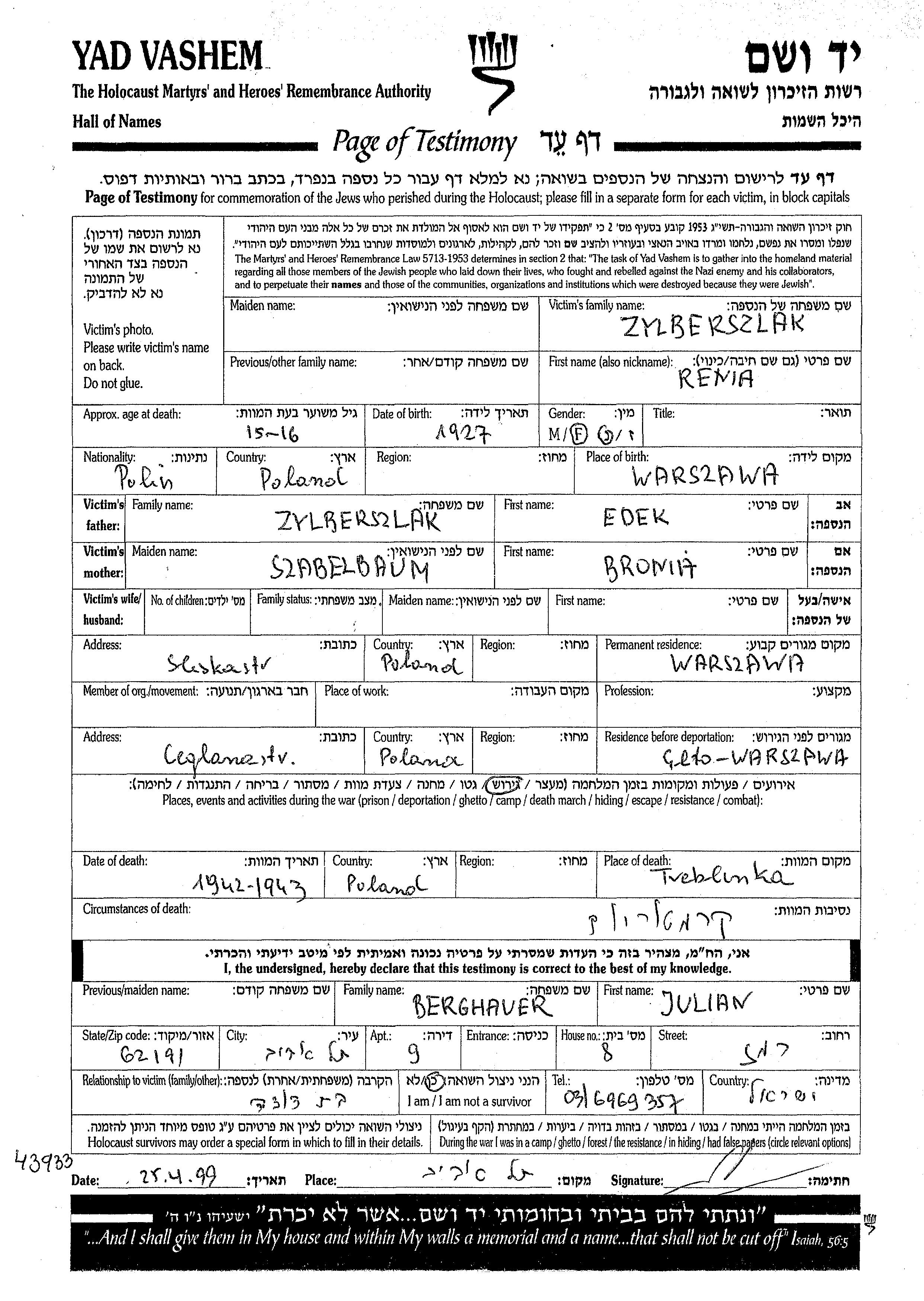 Reina Zylberszlak wurde im Jahr 1927 in Warszawa, Polen geboren. Sie war die Tochter von Edek und Bronia. Sie war Kind. Vor dem Zweiten Weltkrieg lebte sie in Warszawa, Polen. Während des Krieges war sie in Warszawa, Polen.