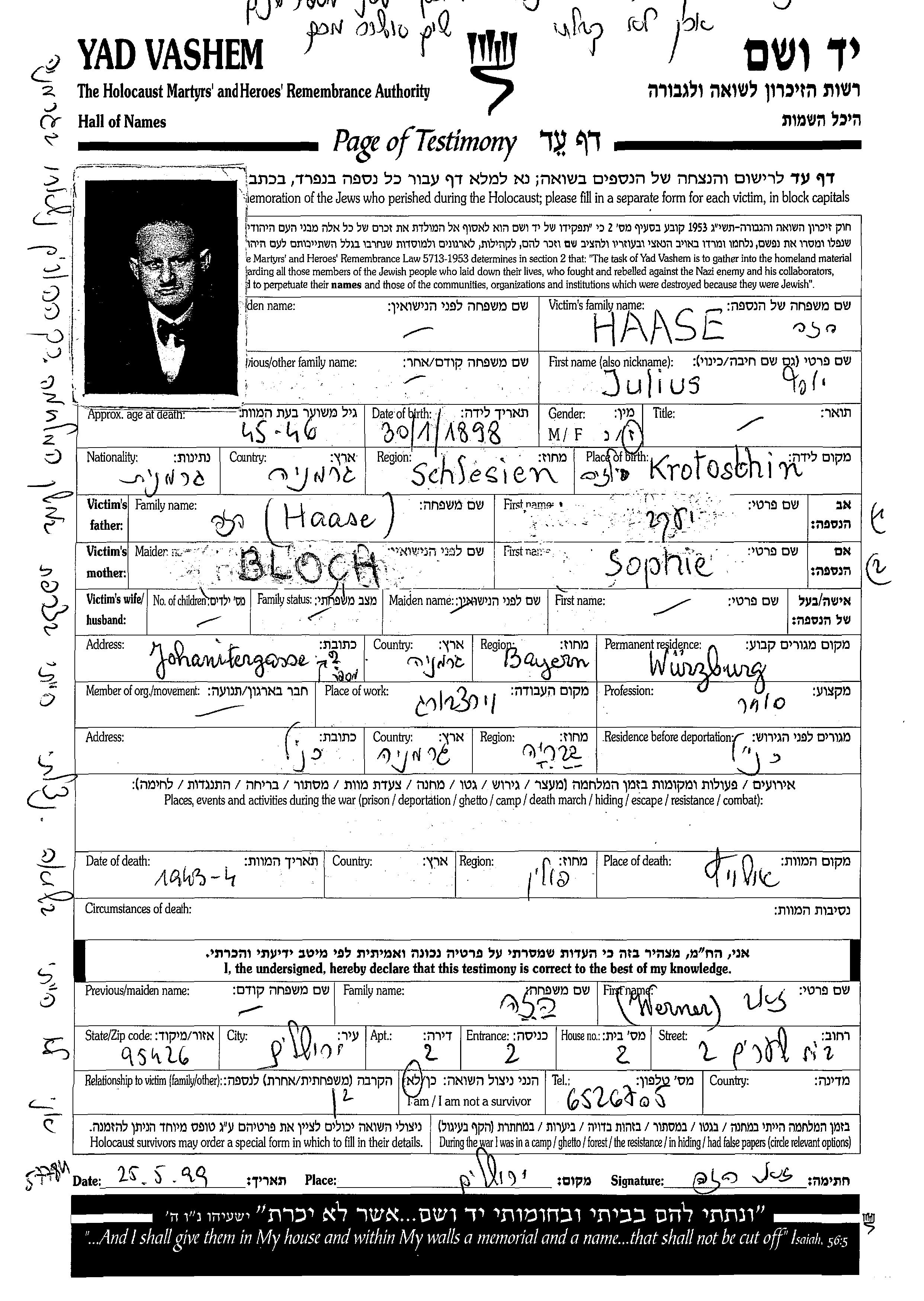 Julius Yosef Haase wurde im Jahr 1898 in Krotoschin, Polen geboren. Er war der Sohn von Yaakov und Sophie. Er war Kaufmann/-frau und Verheiratet. Vor dem Zweiten Weltkrieg lebte er in Wuerzburg, Deutsches Reich. Während des Krieges war er in Wuerzburg, Deutsches Reich.