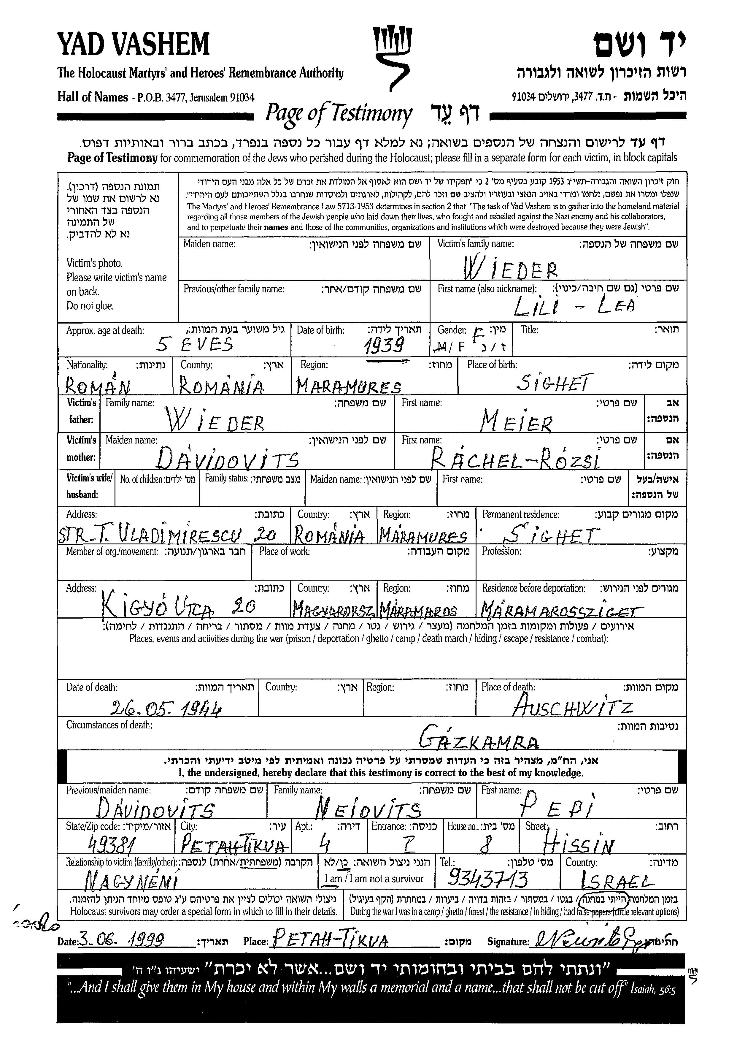 Lili Lea Wieder wurde im Jahr 1939 in Sighet, Rumänien geboren. Sie war die Tochter von Meir und Machel Rozsi. Vor dem Zweiten Weltkrieg lebte sie in Sighet, Rumänien. Während des Krieges war sie in Sighet, Rumänien.