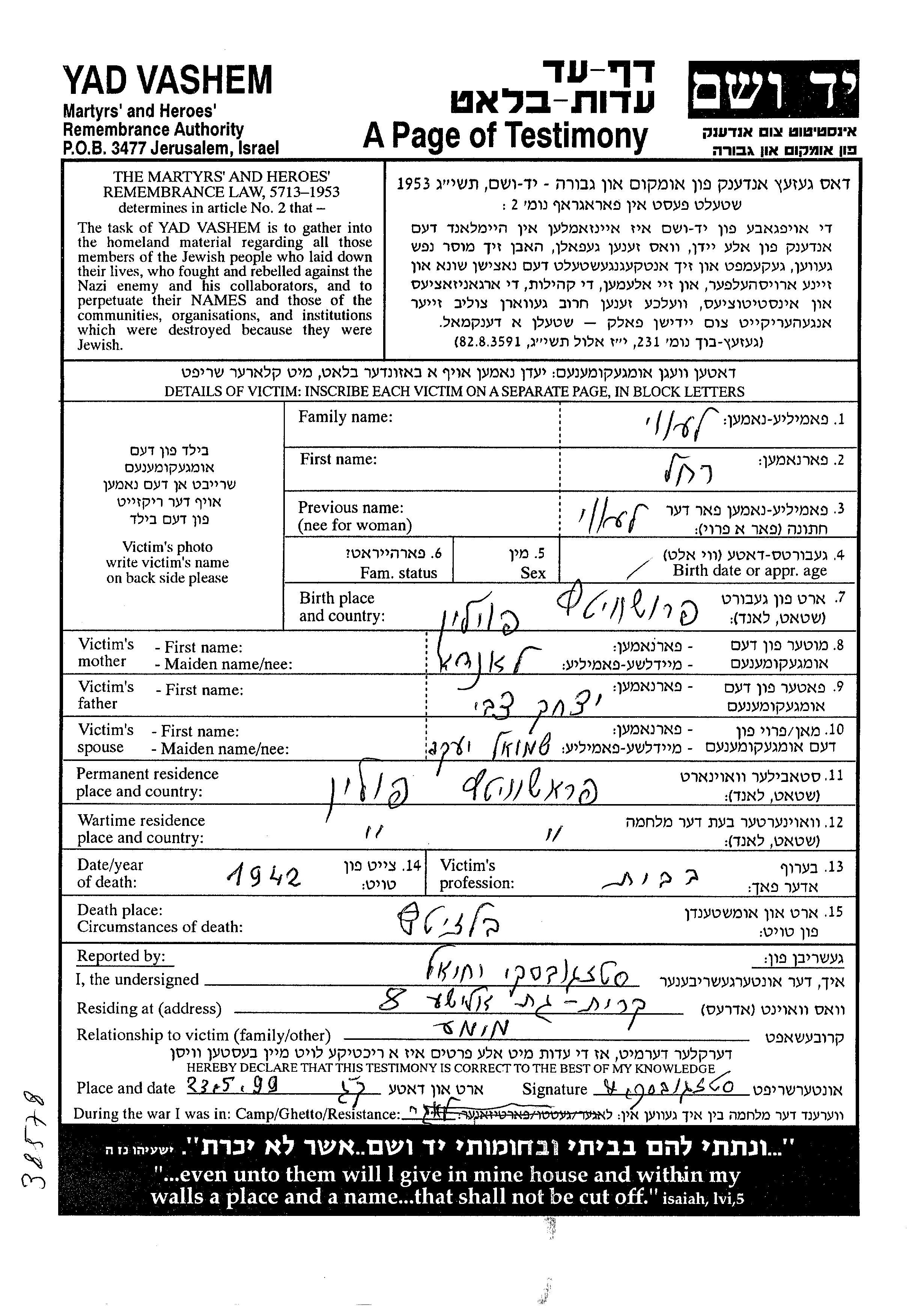 Rakhel wurde in der Schoah ermordet. Todesort: Belzec, Polen im Jahr 1942.