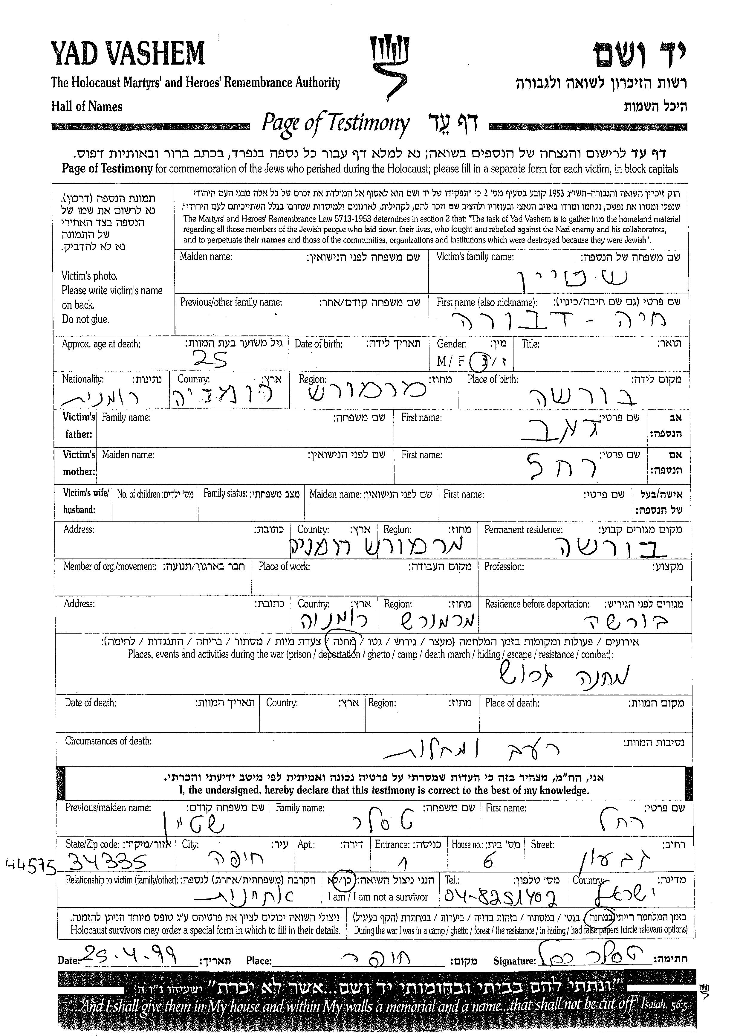 Shtein Khaia Dvora Borsa, Rumänien Gedenkblatt