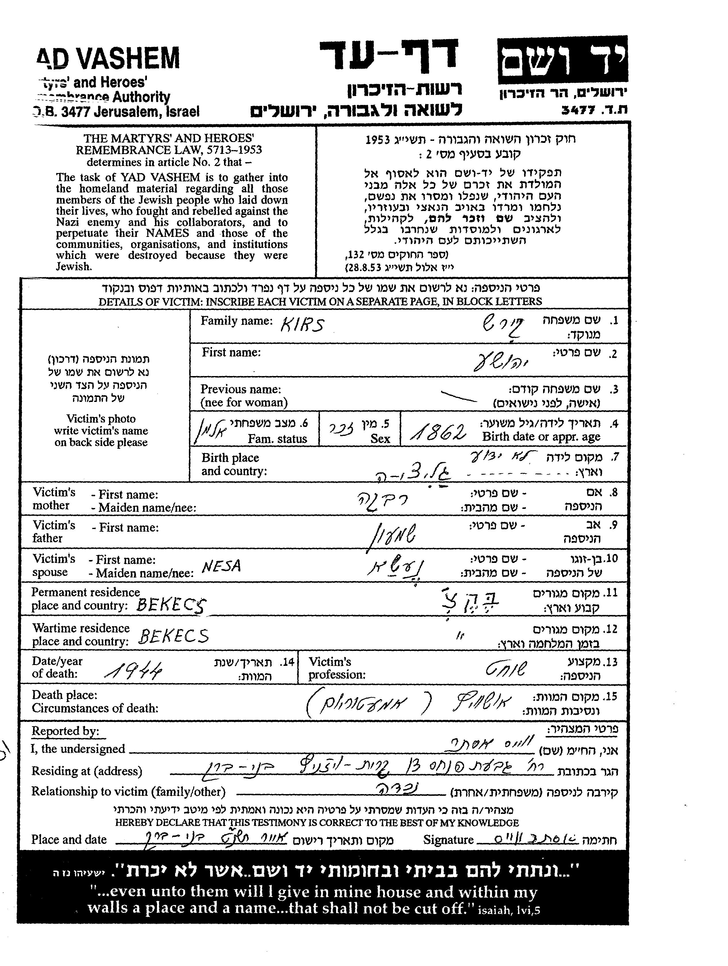 Yehoshua Kirs wurde im Jahr 1862 in Galizien Region, Polen geboren. Er war der Sohn von Shimon und Rivka. Er war Schächter und mit Nesa Witwer. Vor dem Zweiten Weltkrieg lebte er in Bekecs, Ungarn. Während des Krieges war er in Bekecs, Ungarn.