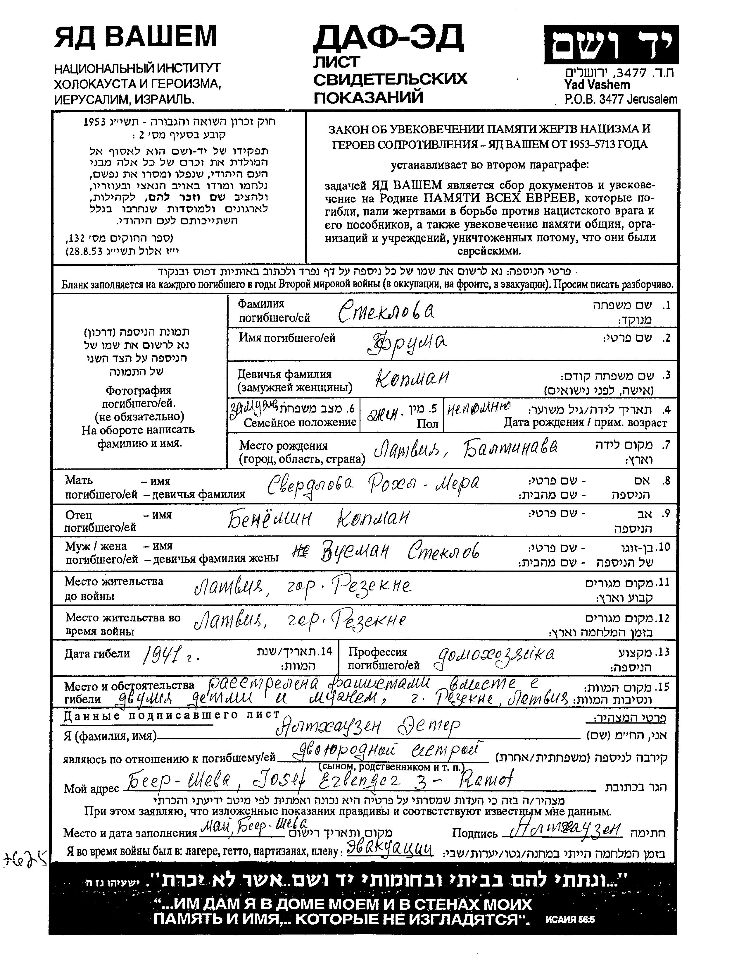 Fruma Steklova, geb. Kopman wurde in Baltinova, Lettland geboren. Sie war die Tochter von Beniomin und Rokhl Mera. Sie war Hausfrau und mit Zusman Verheiratet. Vor dem Zweiten Weltkrieg lebte sie in Rēzekne, Lettland. Während des Krieges war sie in Rēzekne, Lettland.