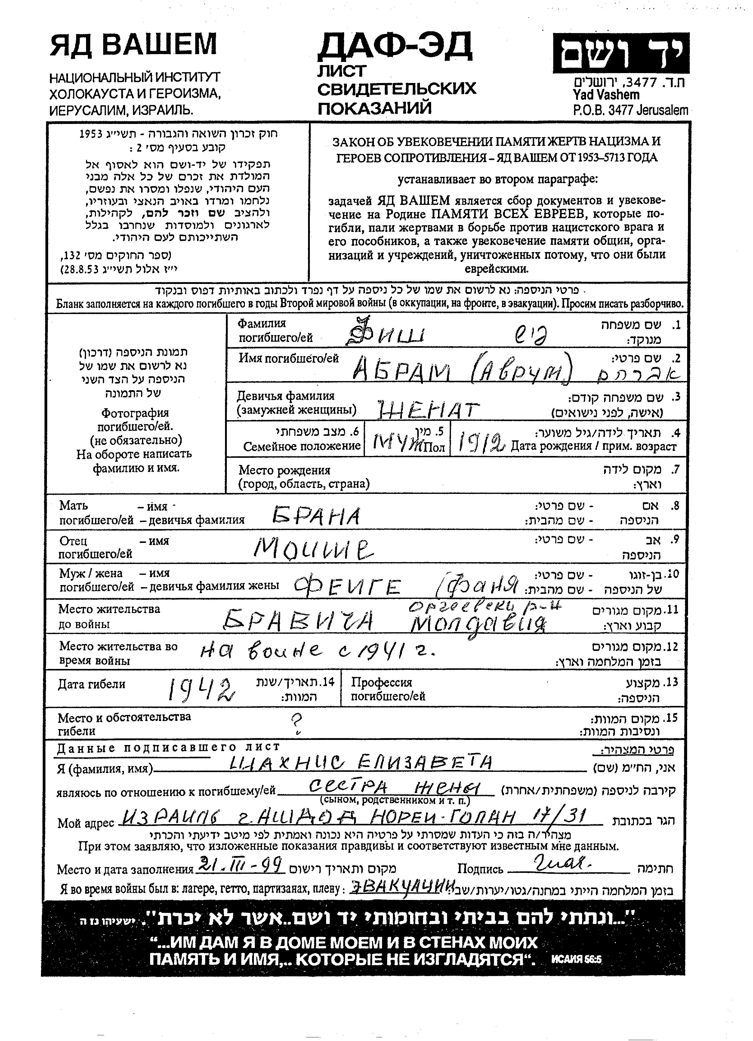 Abram Fish wurde im Jahr 1912 geboren. Er war der Sohn von Moishe und Brana. Er war mit Feiga Fanya Verheiratet. Vor dem Zweiten Weltkrieg lebte er in Bravicha, Rumänien. Während des Krieges war er in die Sowjetischen Streitkräfte. Abram im Militärdienst umgekommen. Todesort: die Sowjetischen Streitkräfte im Jahr 1942.