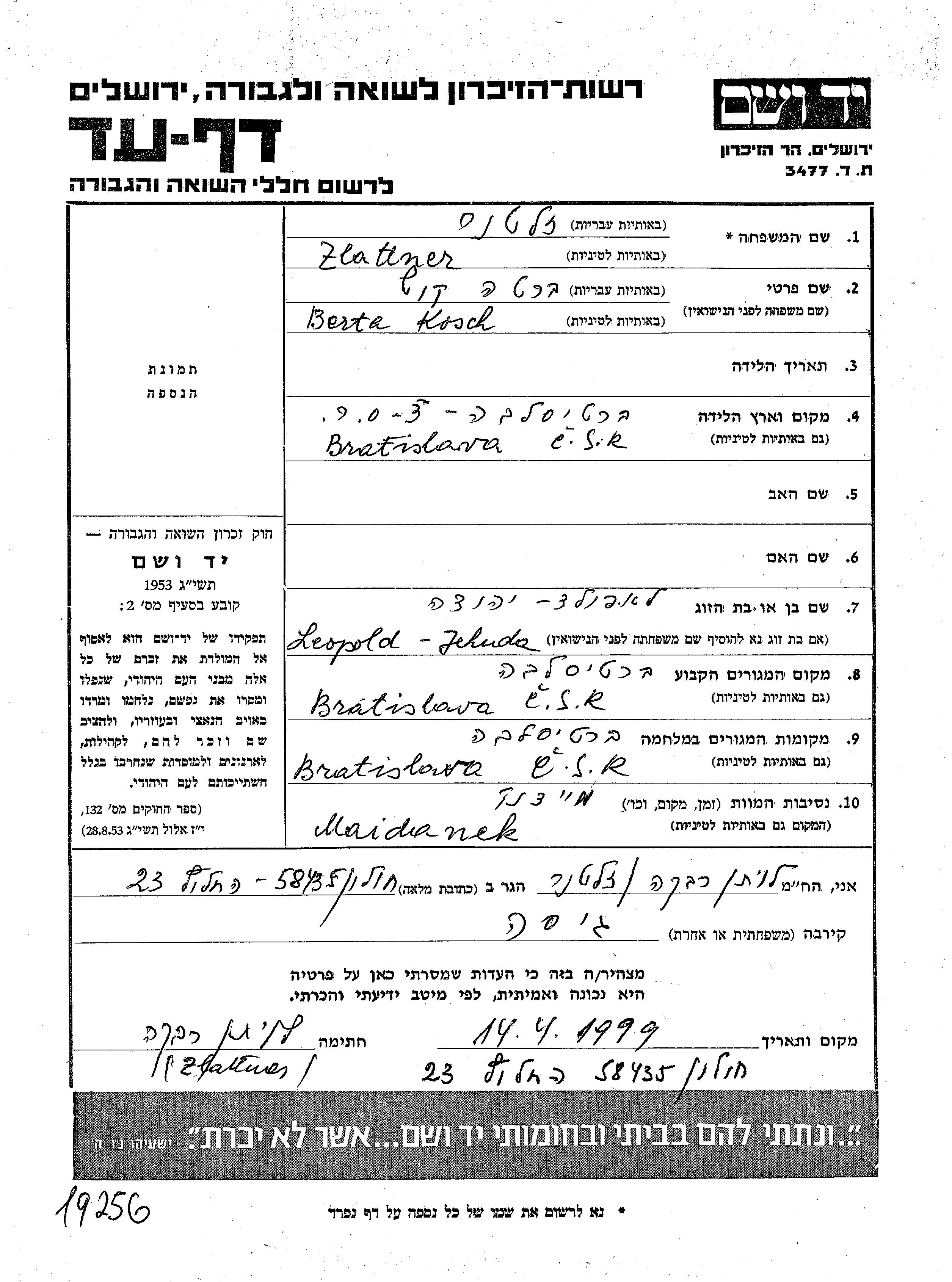 Berta Zlattner, geb. Kosch wurde in Bratislava, Tschechoslowakei geboren. Vor dem Zweiten Weltkrieg lebte sie in Bratislava, Tschechoslowakei. Während des Krieges war sie in Bratislava, Tschechoslowakei.
