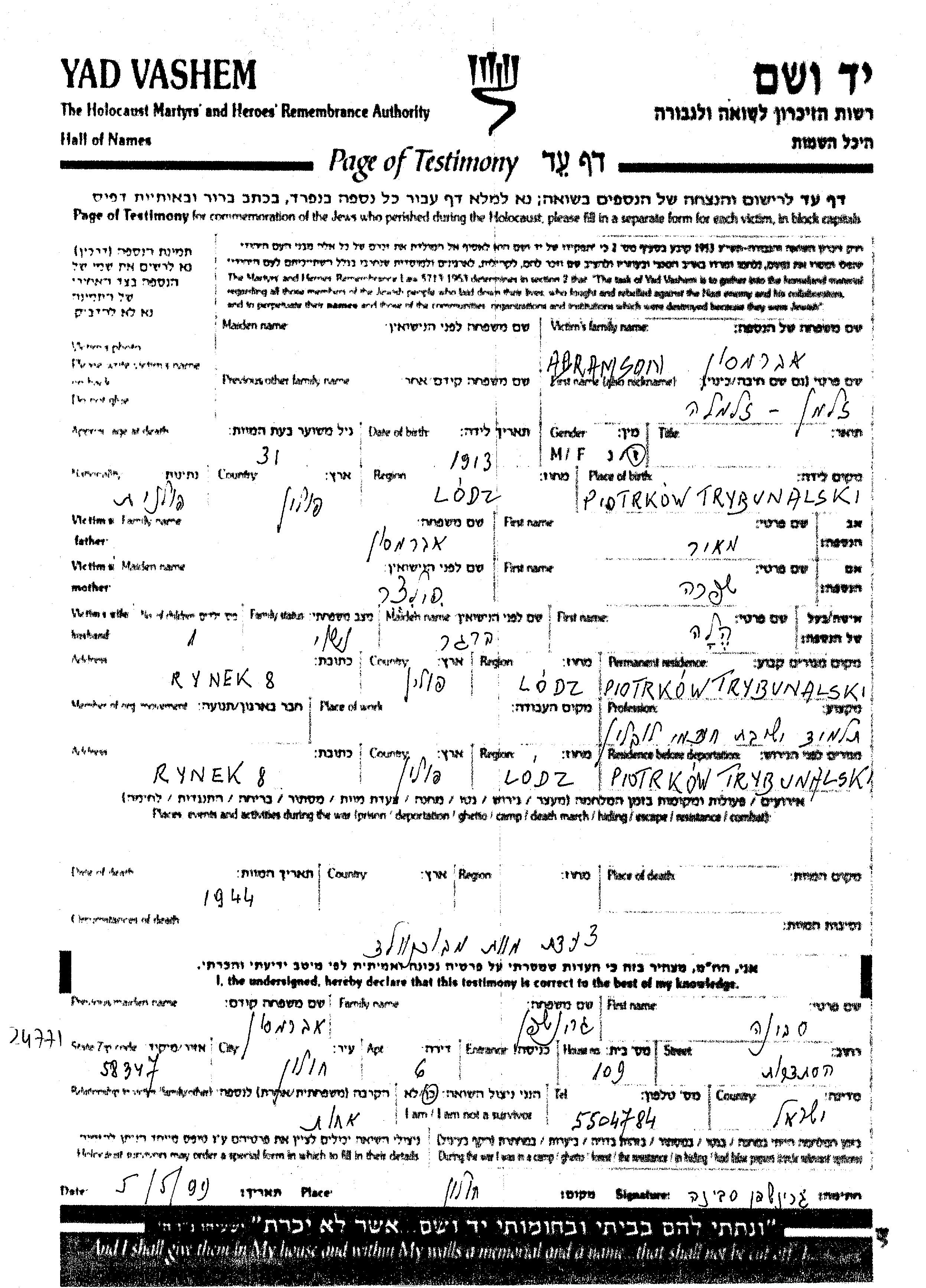 Abramson Zalman 1913 Piotrkow Trybunalski, Polen Gedenkblatt