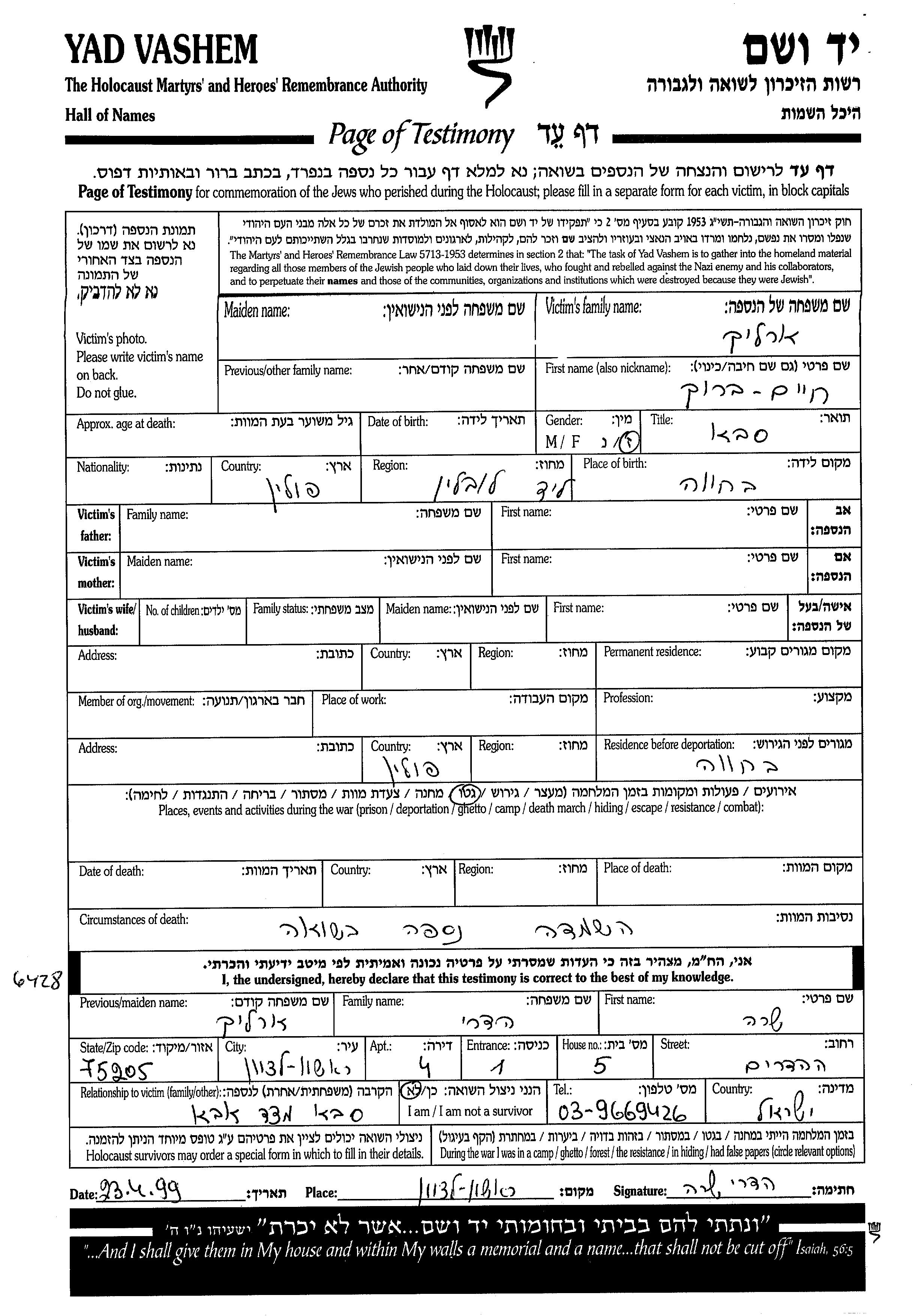 Erlikh Khaim Barukh unbekannter Ort, Gedenkblatt