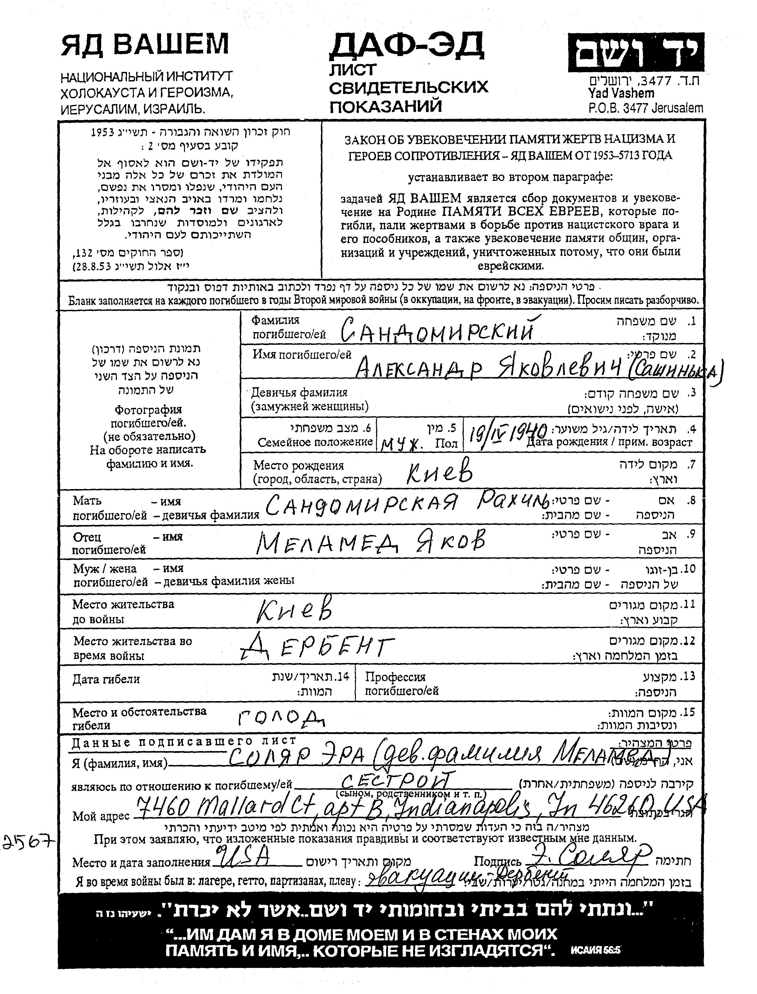 Sandomirski Melamed Aleksandr 1940 Kiev, Ukraine (UdSSR) Gedenkblatt