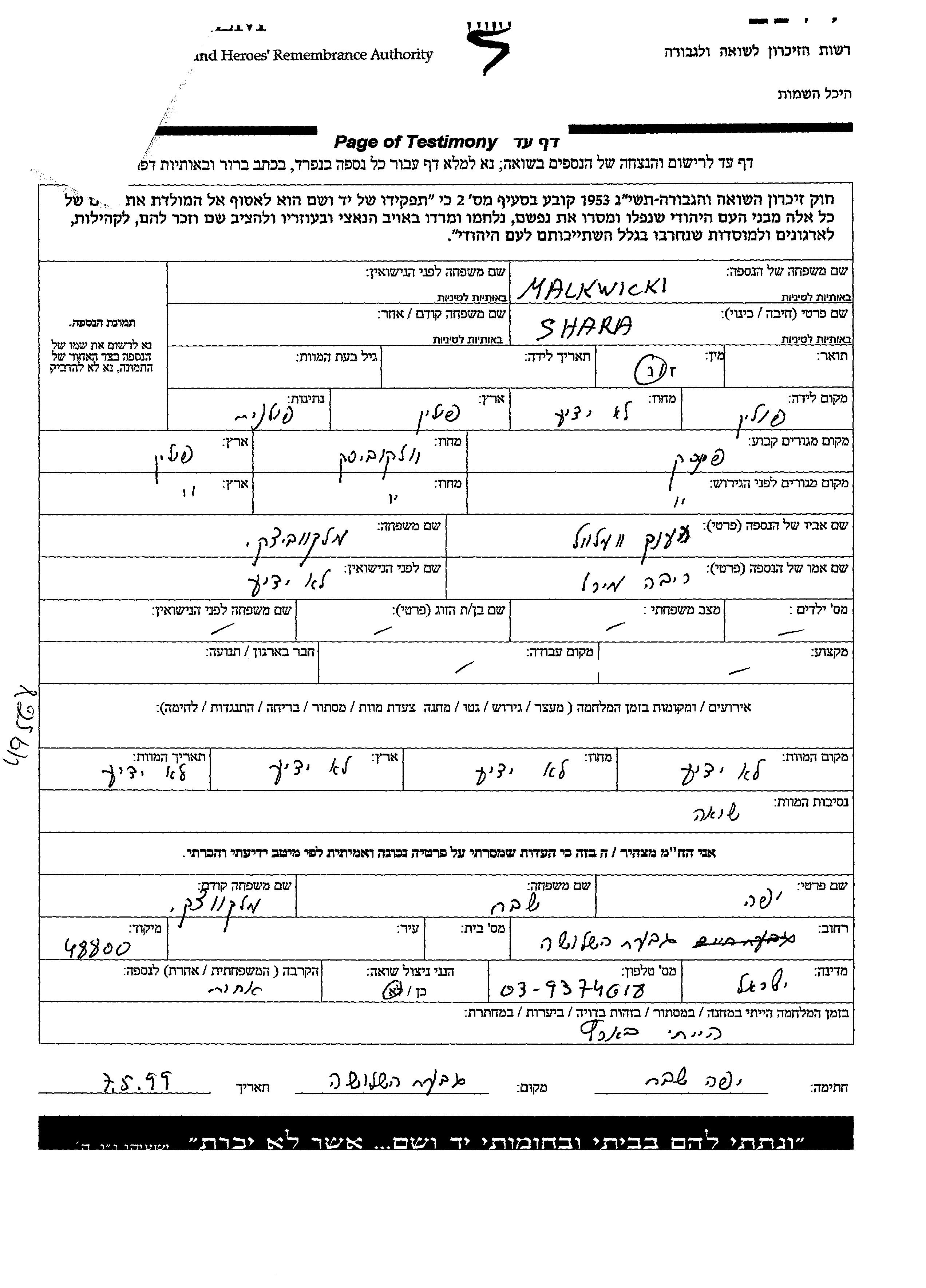Shara Malkwicki wurde in Polen geboren. Sie war die Tochter von Henek Velvel und Riva Mirl. Vor dem Zweiten Weltkrieg lebte sie in Pinsk, Polen. Während des Krieges war sie in Pinsk, Polen.
