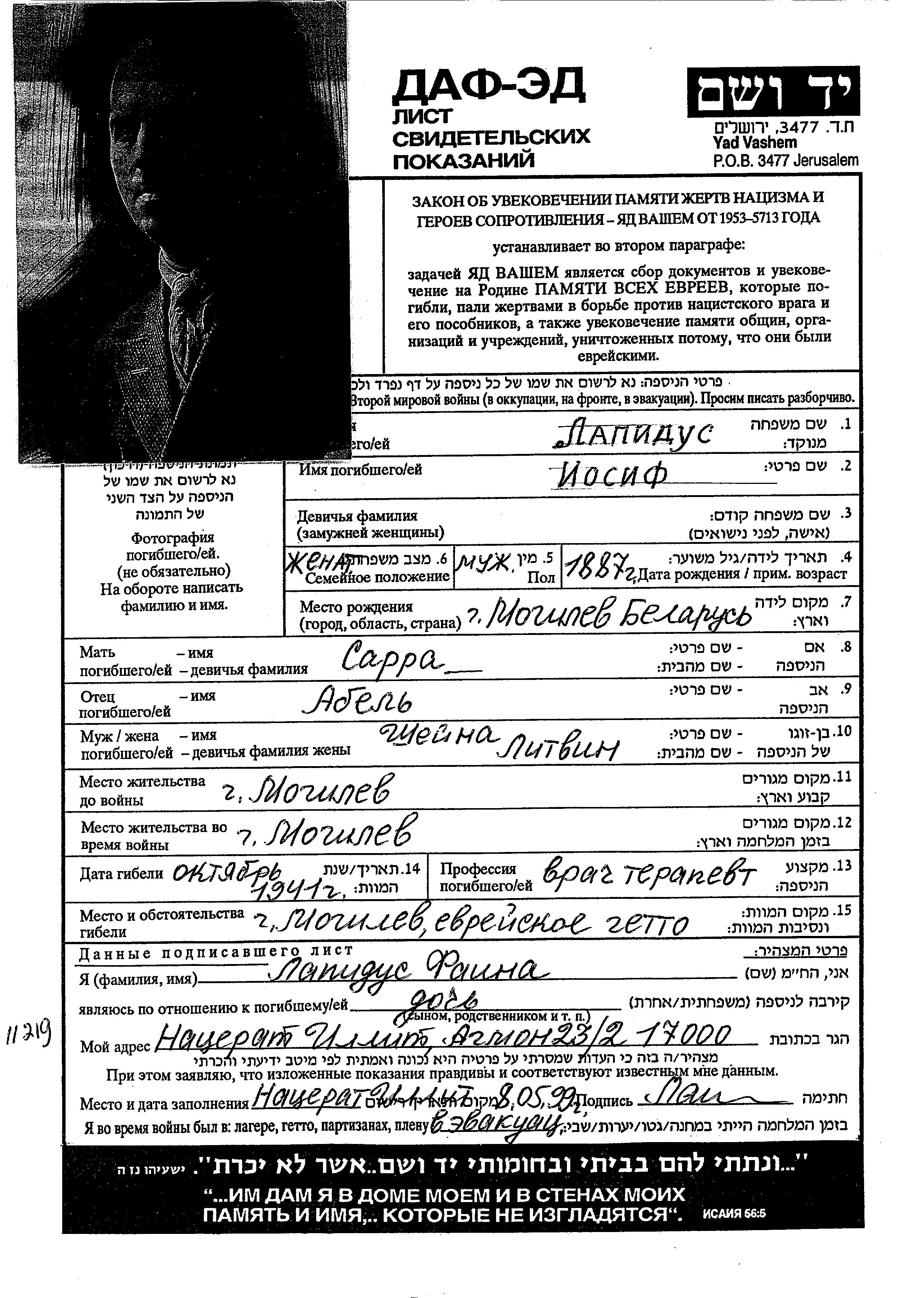 Iosif wurde in der Schoah ermordet. Todesort: Mogilev, Weißrussland (UdSSR) im Jahr 10/1941.