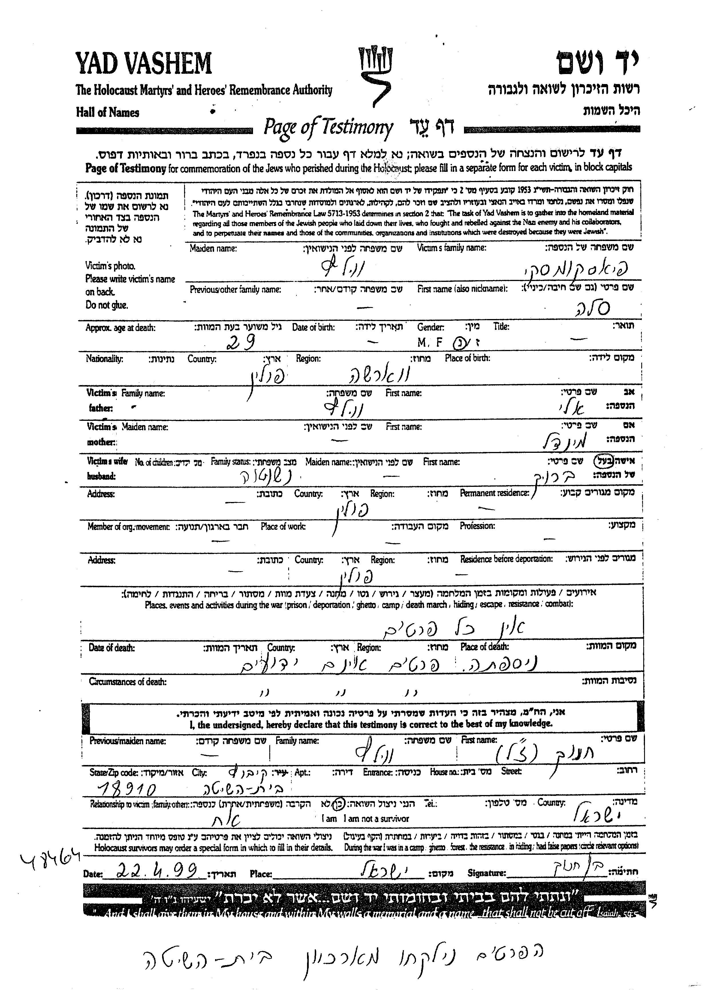 Sala Piaskomski, geb. Volf wurde in Warszawa, Polen geboren. Sie war die Tochter von Eli und Mindl. Sie war mit Barukh Verheiratet. Vor dem Zweiten Weltkrieg lebte sie in Polen. Während des Krieges war sie in Polen.