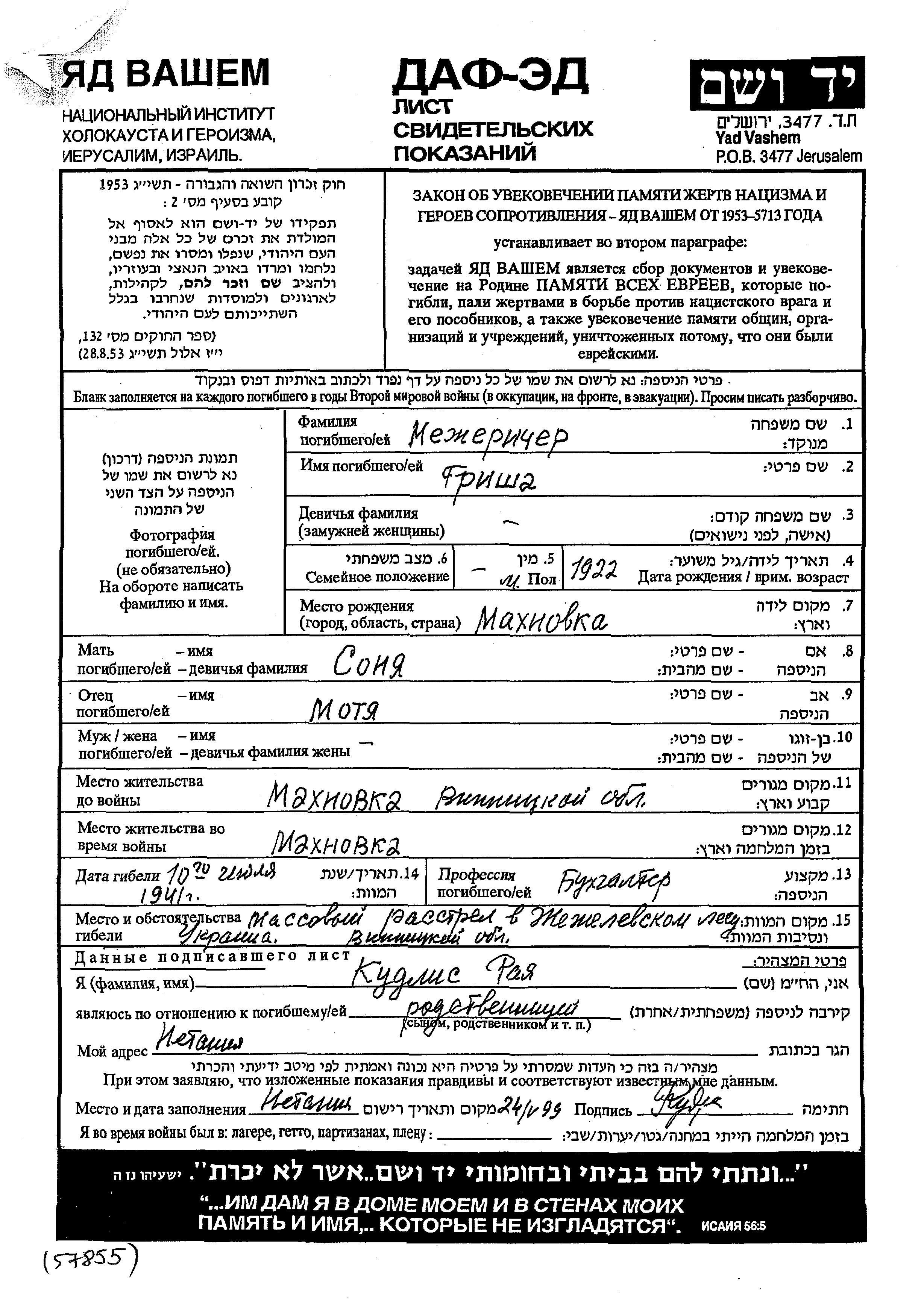 Grisha Mezhericher wurde im Jahr 1922 in Makhnovka, Ukraine (UdSSR) geboren. Er war der Sohn von Motia und Sonia. Er war Wirtschaftsprüfer/-in. Vor dem Zweiten Weltkrieg lebte er in Makhnovka, Ukraine (UdSSR). Während des Krieges war er in Makhnovka, Ukraine (UdSSR).