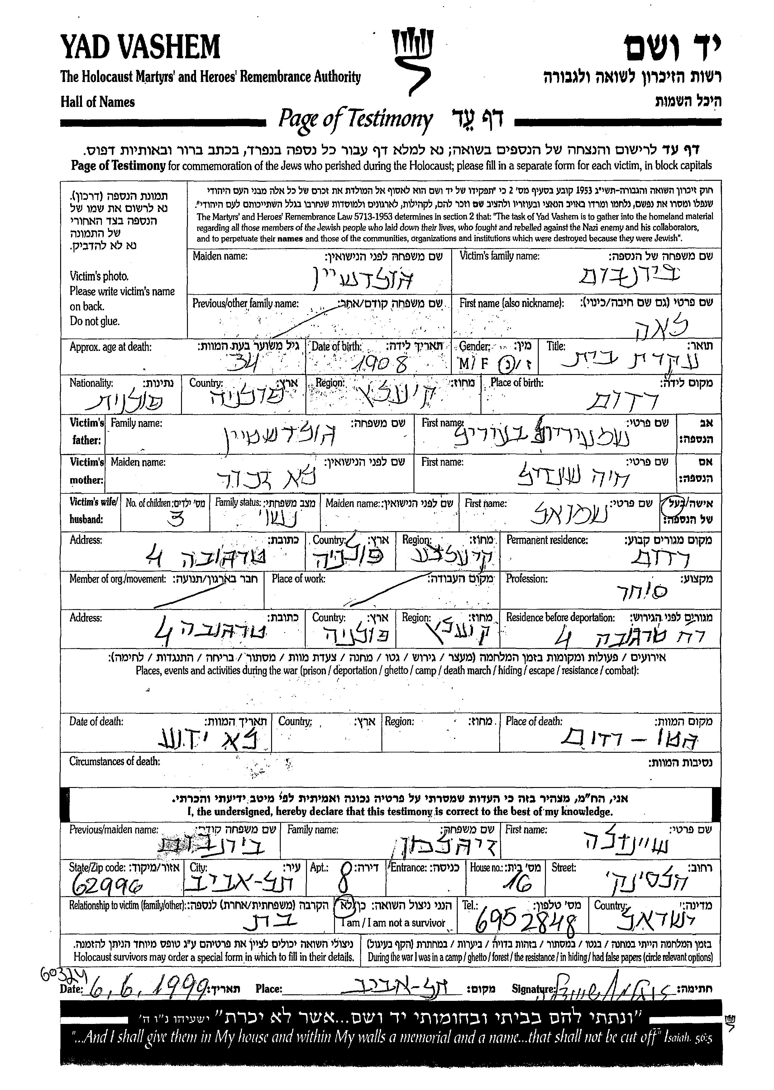 Lea Birnbaum, geb. Goldshein wurde im Jahr 1908 in Radom, Polen geboren. Sie war die Tochter von Shmariahu Beiril und Khaia Sheina. Sie war Hausfrau und mit Shmuel Verheiratet. Vor dem Zweiten Weltkrieg lebte sie in Radom, Polen. Während des Krieges war sie in Radom, Polen.