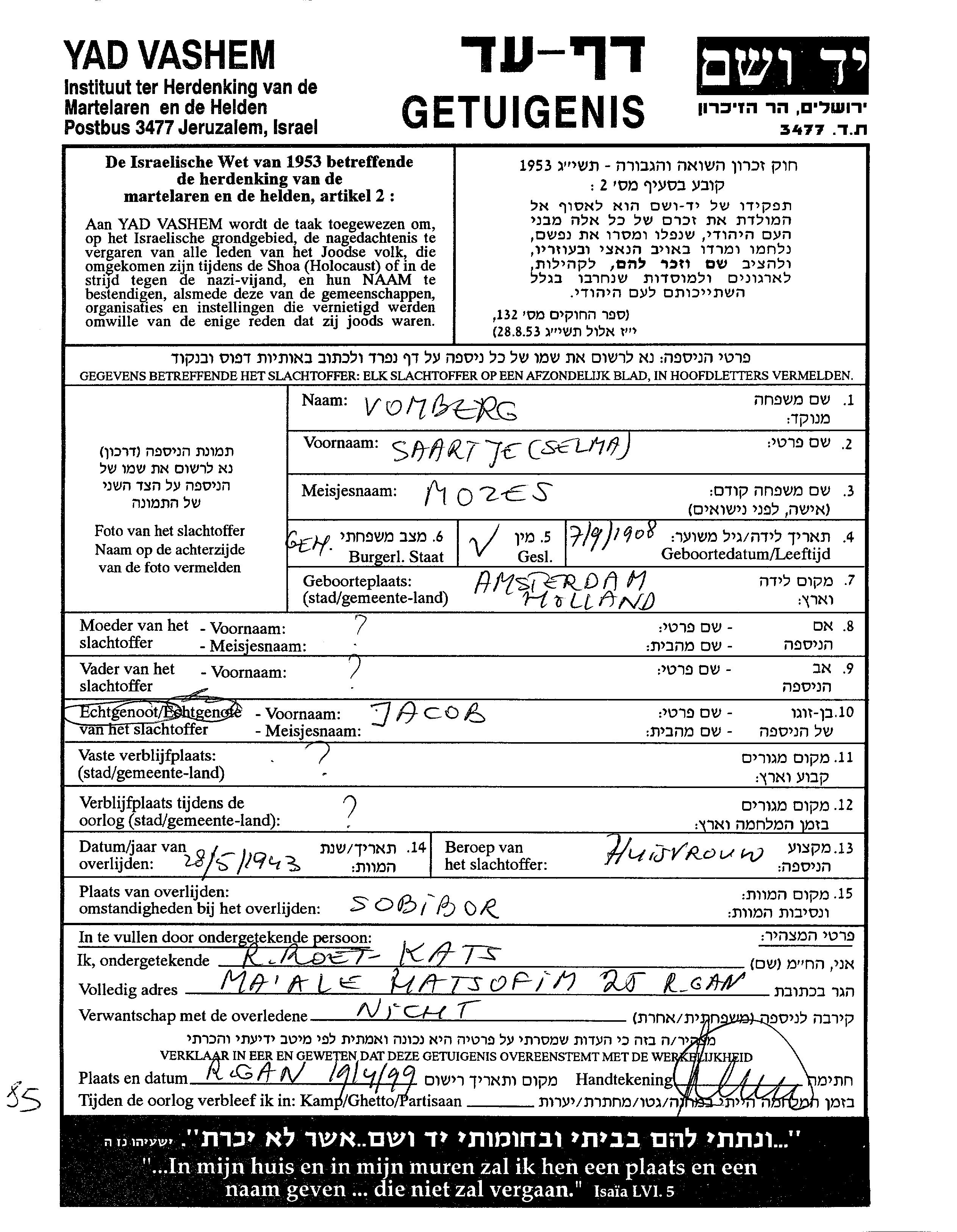 Saartje Selma Vomberg, geb. Mozes wurde im Jahr 1908 in Amsterdam, Niederlande geboren. Sie war Hausfrau und mit Jakob Verheiratet.