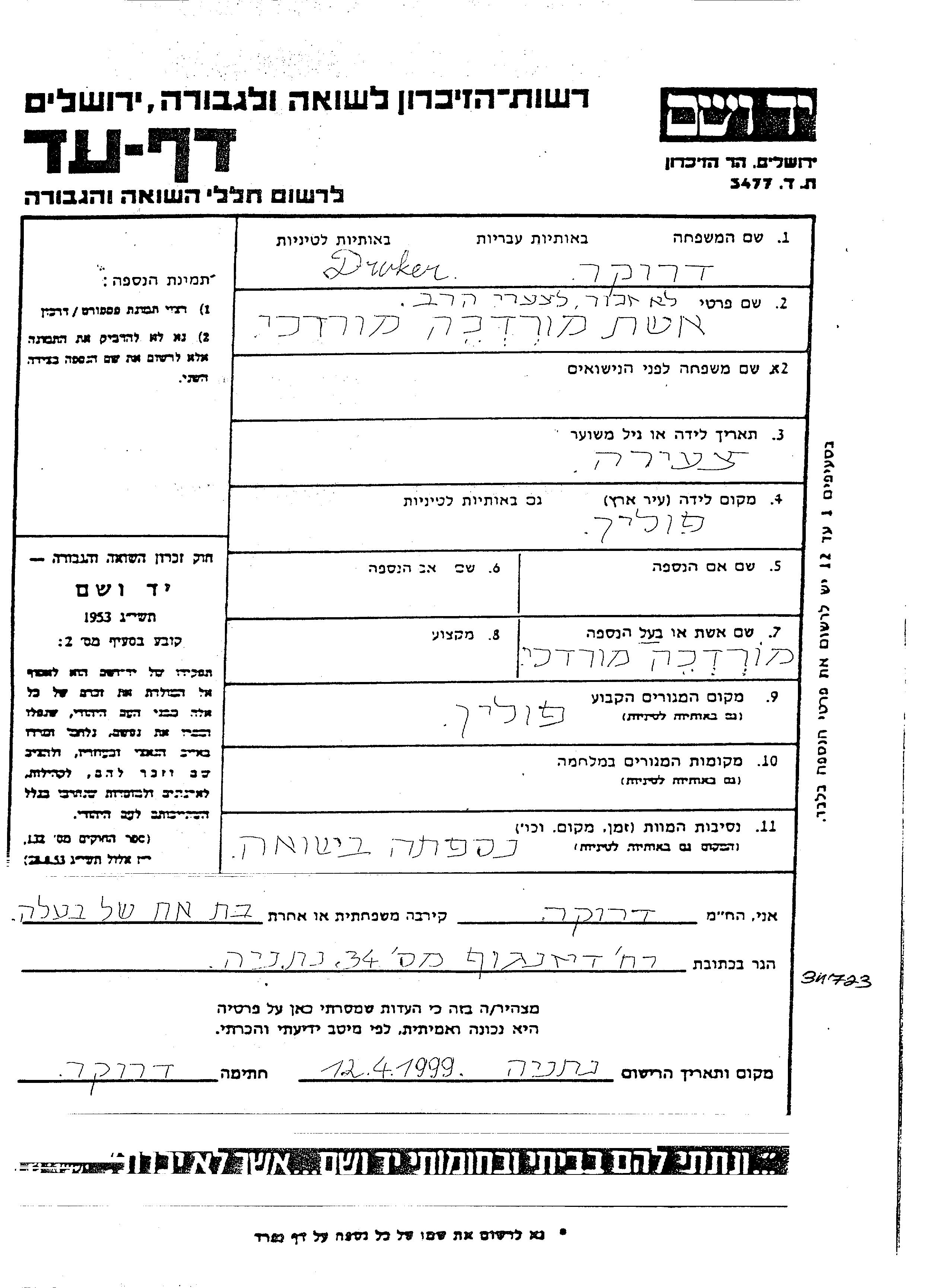 Vorname unbekannt Druker wurde in Polen geboren. Sie war mit Mordekhai Verheiratet. Vor dem Zweiten Weltkrieg lebte sie in Polen.