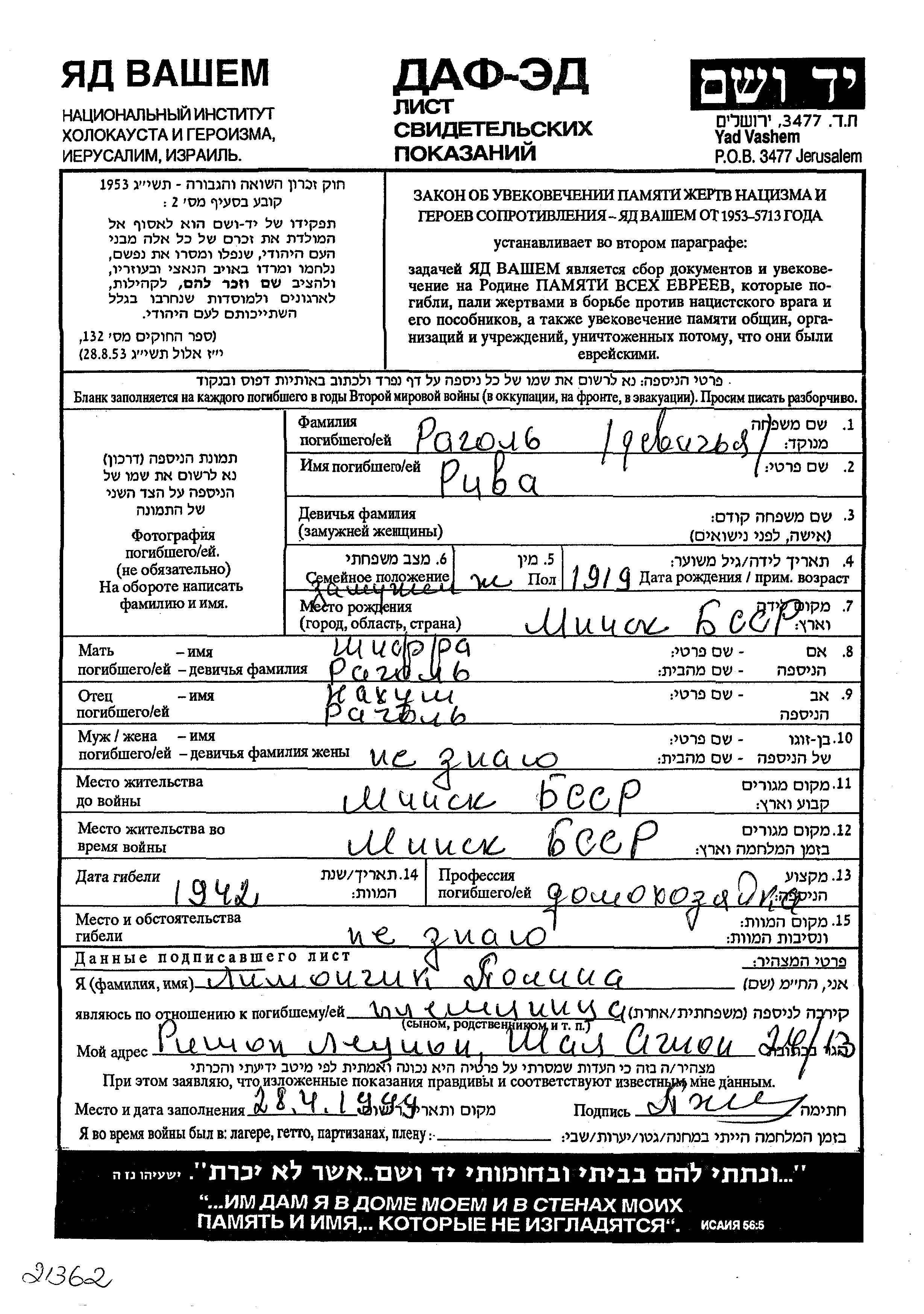 Riva Name unbekannt, geb. Ragol wurde im Jahr 1919 in Minsk, Weißrussland (UdSSR) geboren. Sie war die Tochter von Nakhum und Shifra. Sie war Hausfrau und Verheiratet. Vor dem Zweiten Weltkrieg lebte sie in Minsk, Weißrussland (UdSSR). Während des Krieges war sie in Minsk, Weißrussland (UdSSR).