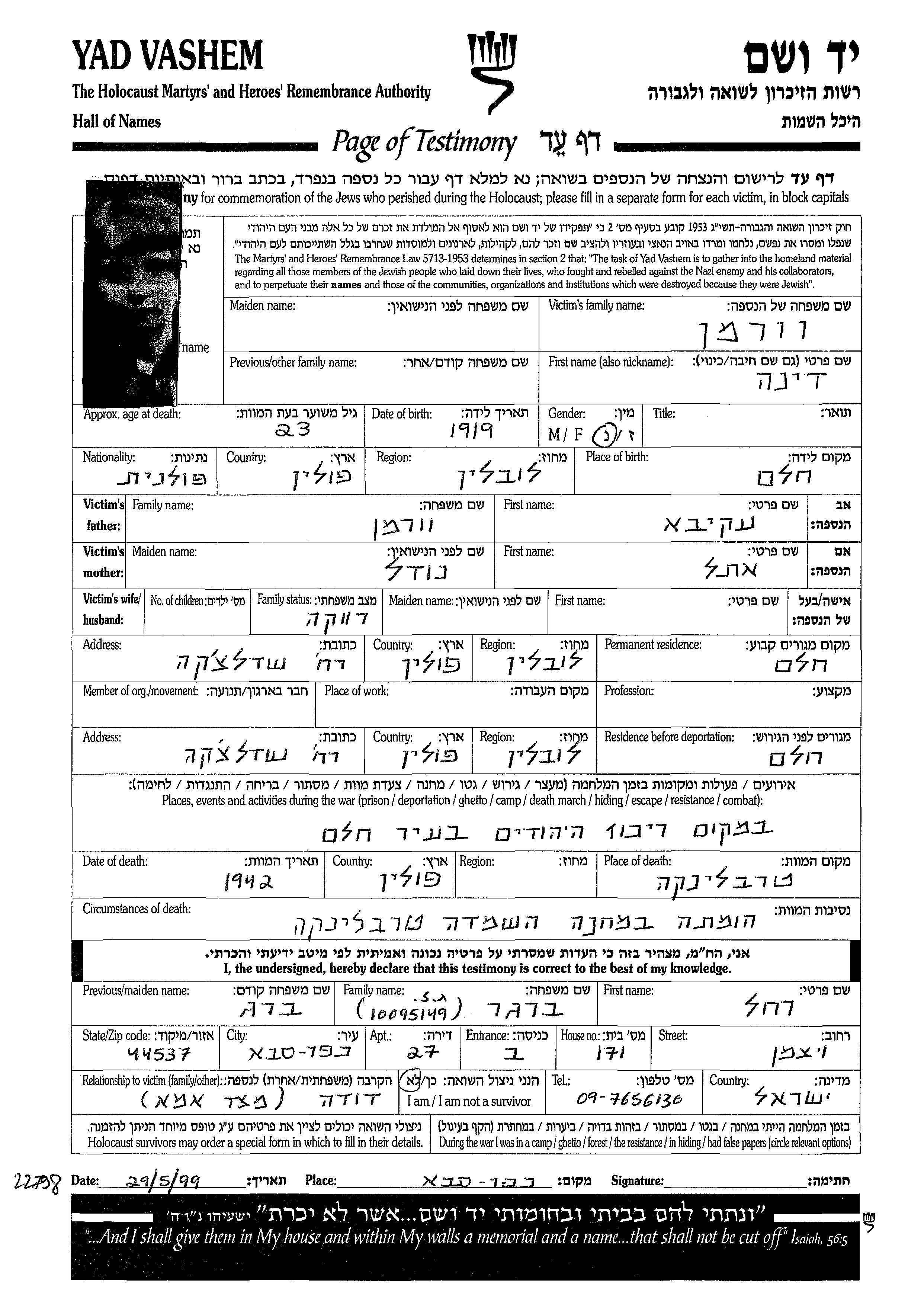Dina wurde in der Schoah ermordet. Todesort: Treblinka, Polen im Jahr 1942.