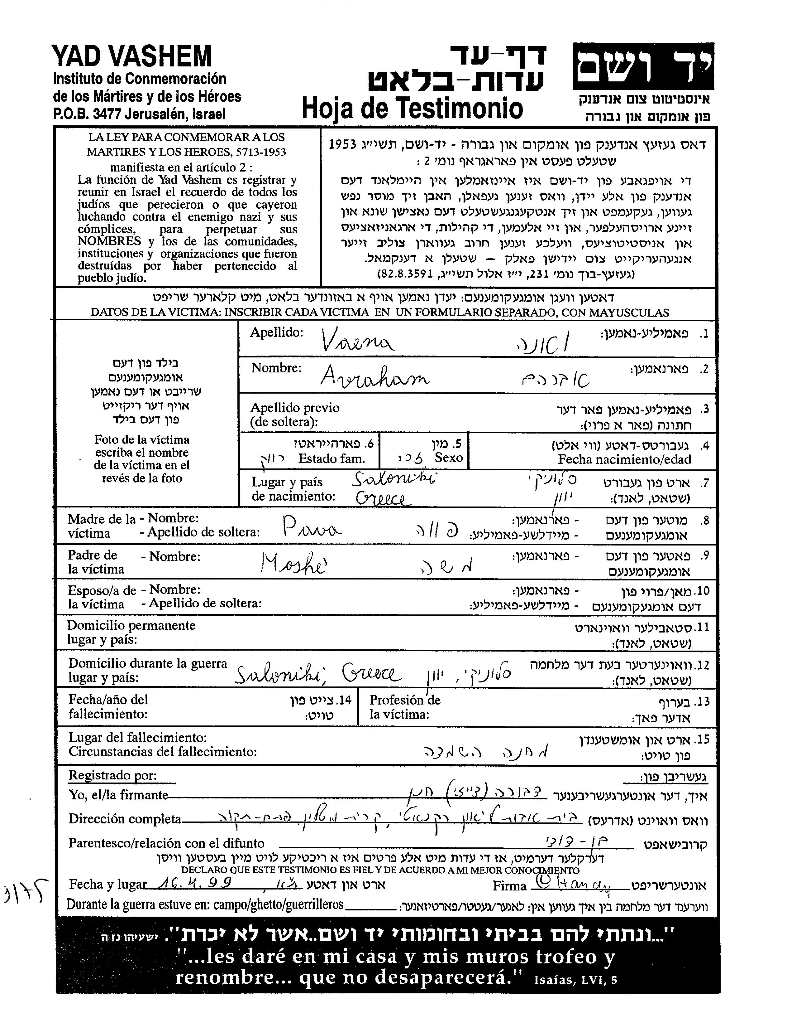 Avraham Vaena wurde in Saloniki, Griechenland geboren. Er war der Sohn von Moshe und Pava. Er war Ledig. Während des Krieges war er in Saloniki, Griechenland.