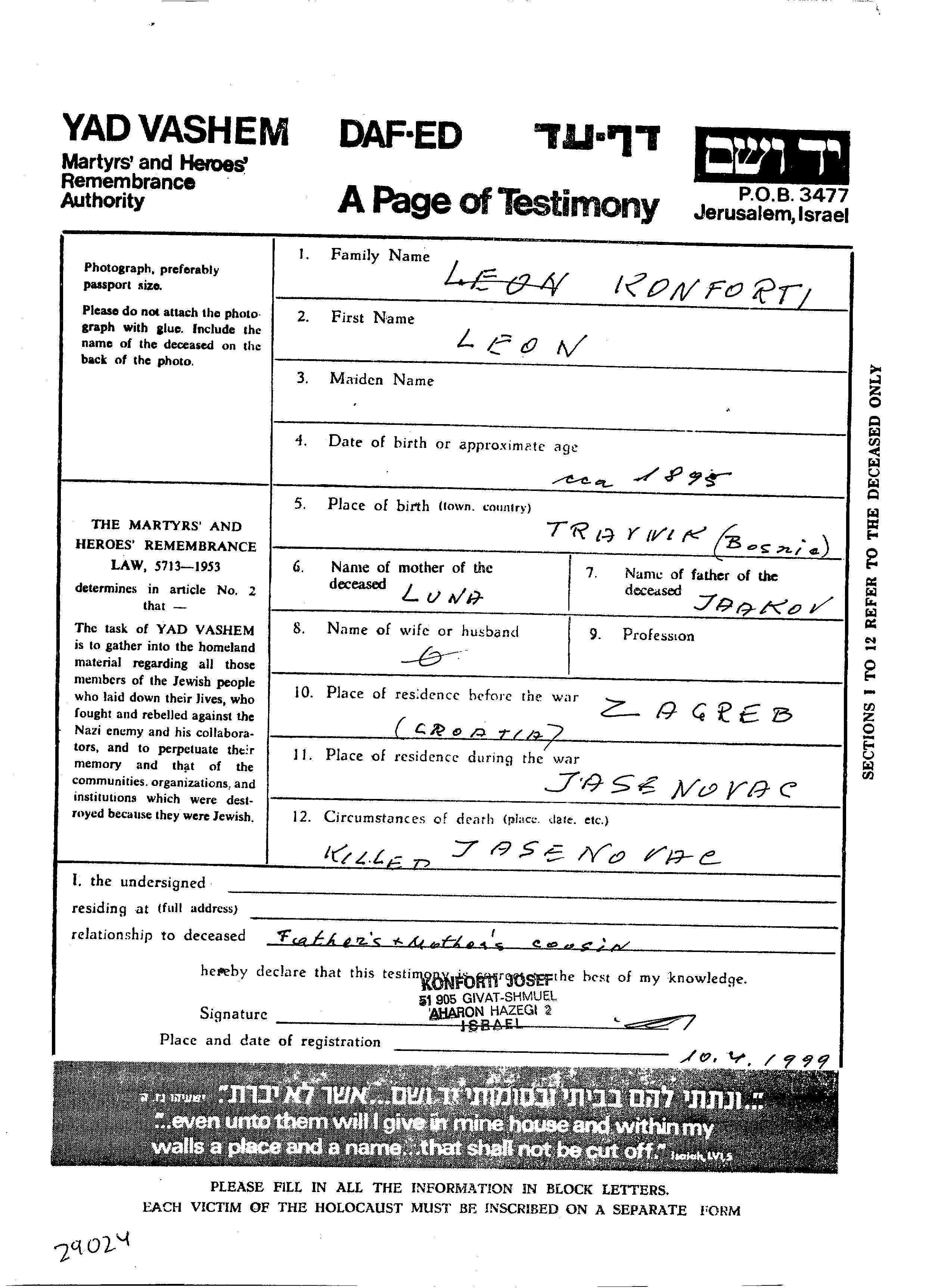 Leon Konforti wurde im Jahr 1895 in Travnik, Jugoslawien geboren. Er war der Sohn von Jaakov und Luna. Vor dem Zweiten Weltkrieg lebte er in Zagreb, Jugoslawien. Während des Krieges war er in Jasenovac, Jugoslawien.