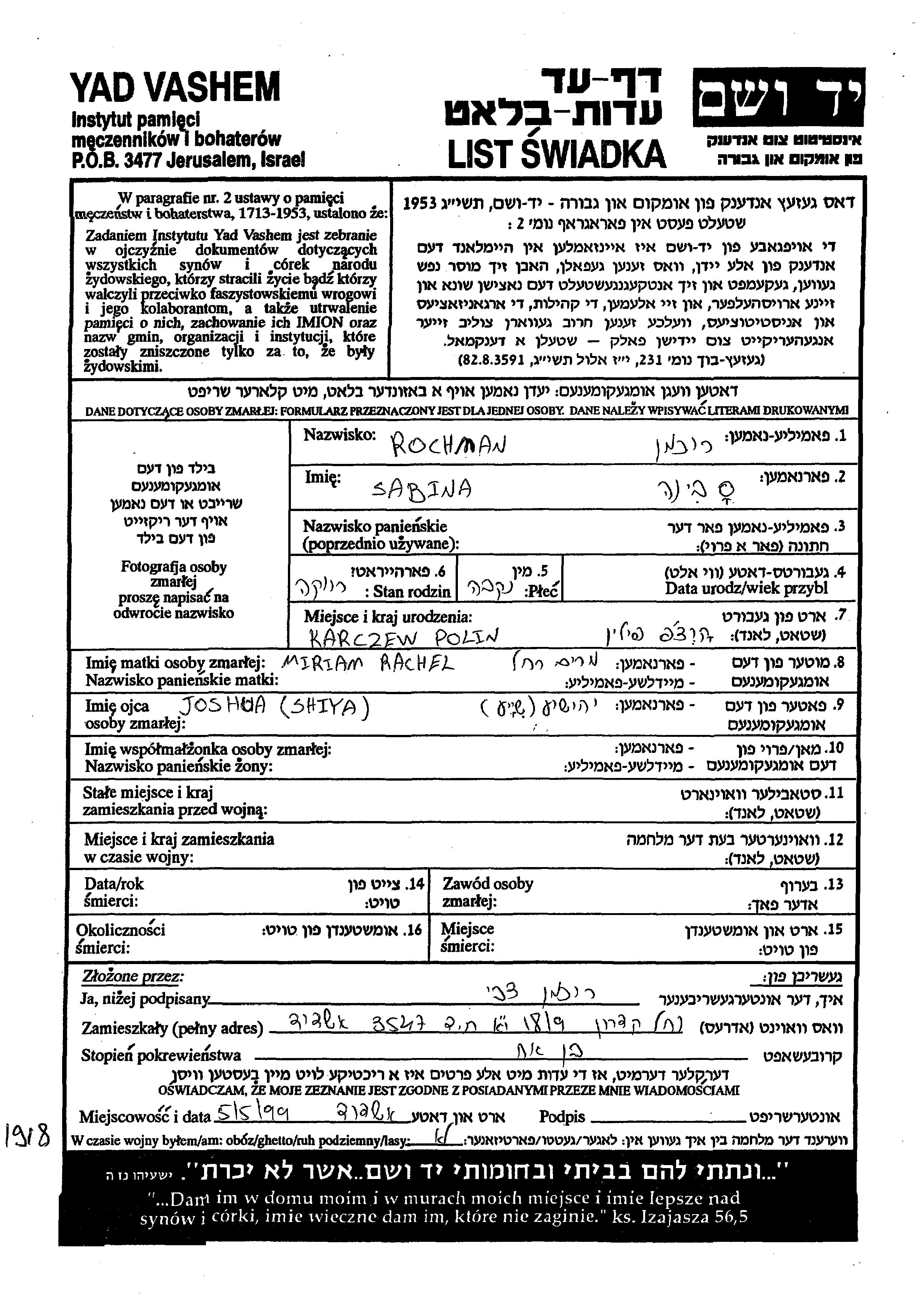 Rochman Sabina unbekannter Ort, Gedenkblatt