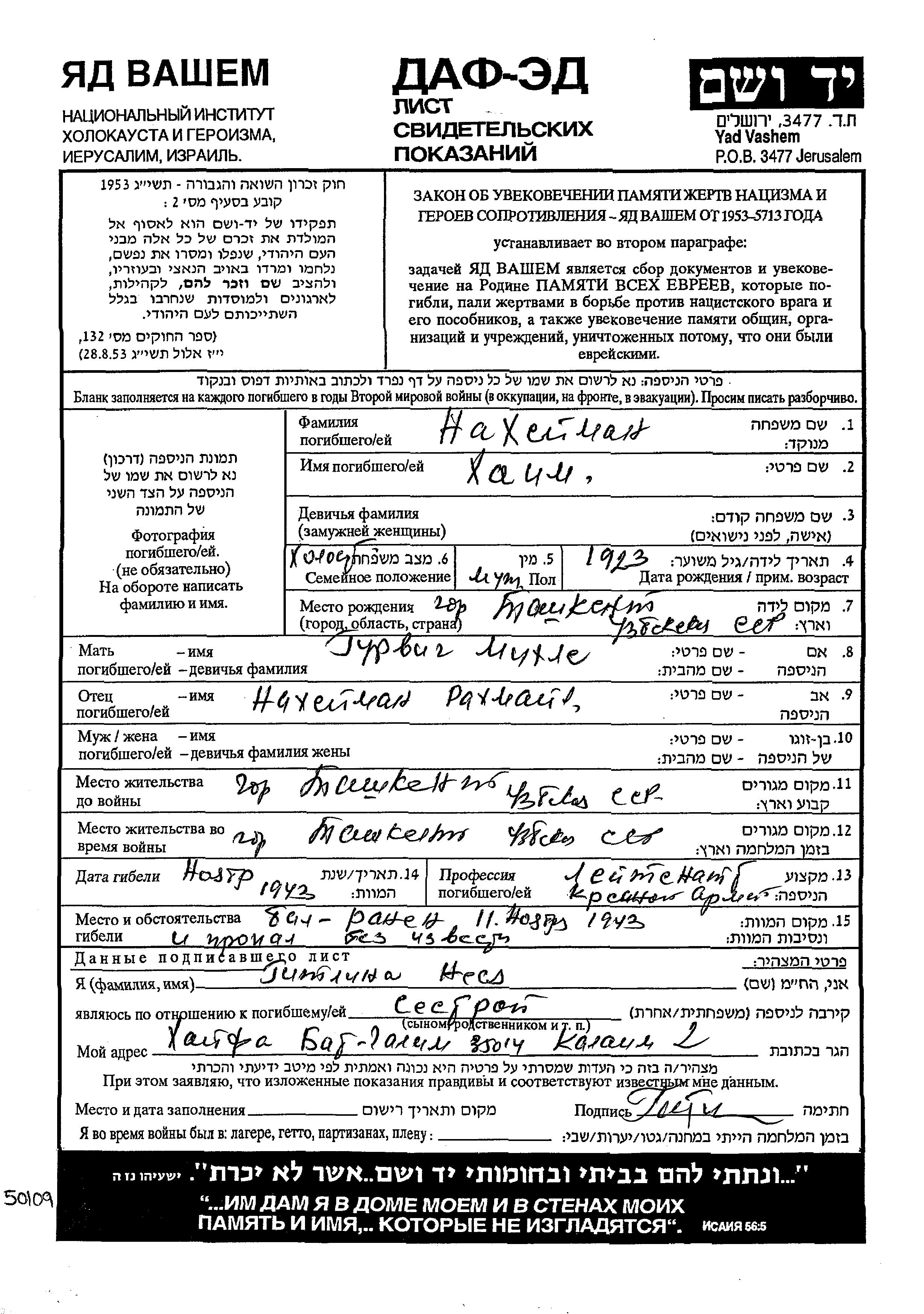 Leutnant Nakheiman wurde in der Schoah ermordet. Todesort: unbekannt im Jahr 11/1943.