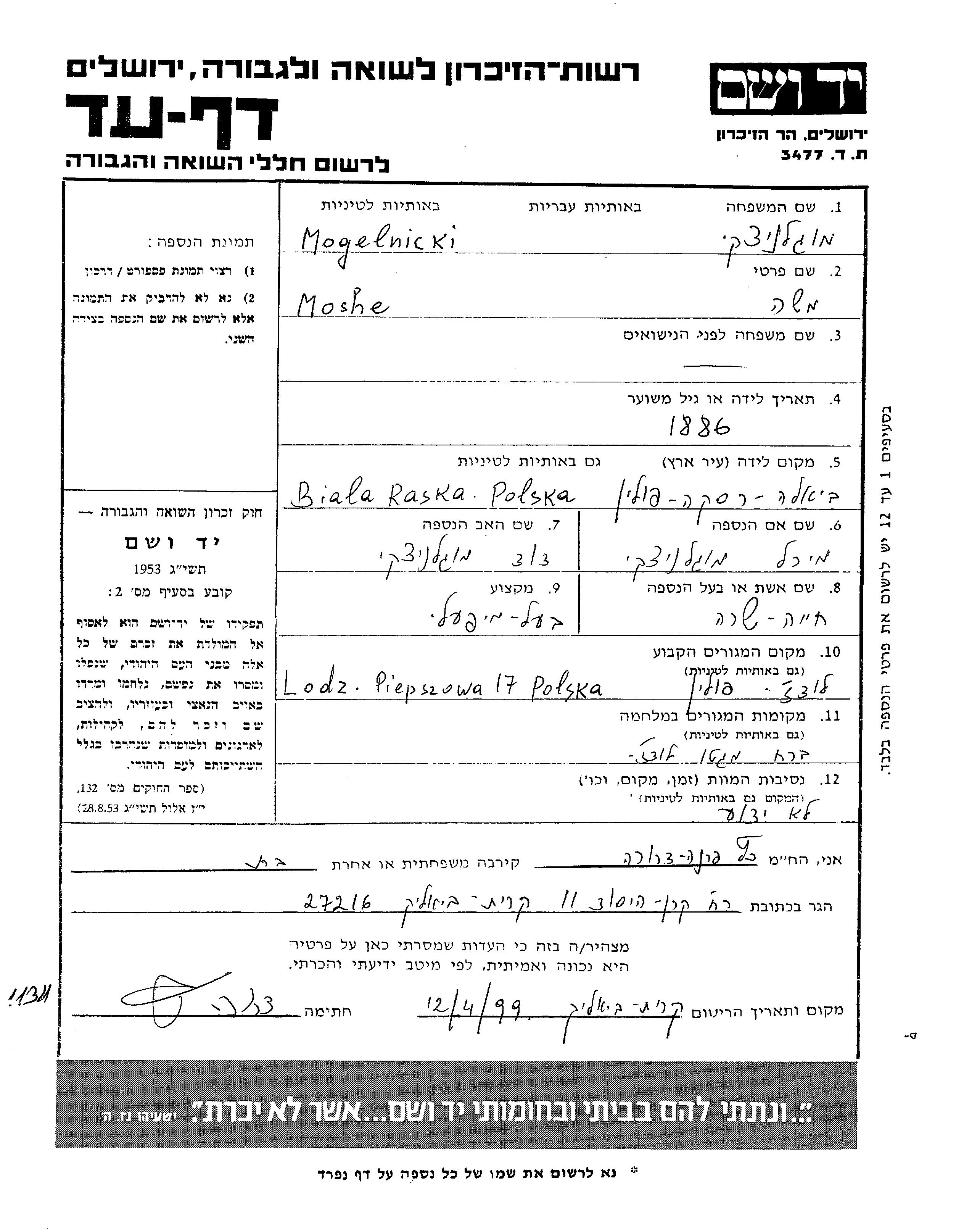 Moshe Mogelnicki wurde im Jahr 1886 in Biala Ravska, Polen geboren. Er war der Sohn von David und Mikhal. Er war Fabrikant/-in. Vor dem Zweiten Weltkrieg lebte er in Lodz, Polen. Während des Krieges war er in Lodz, Polen.