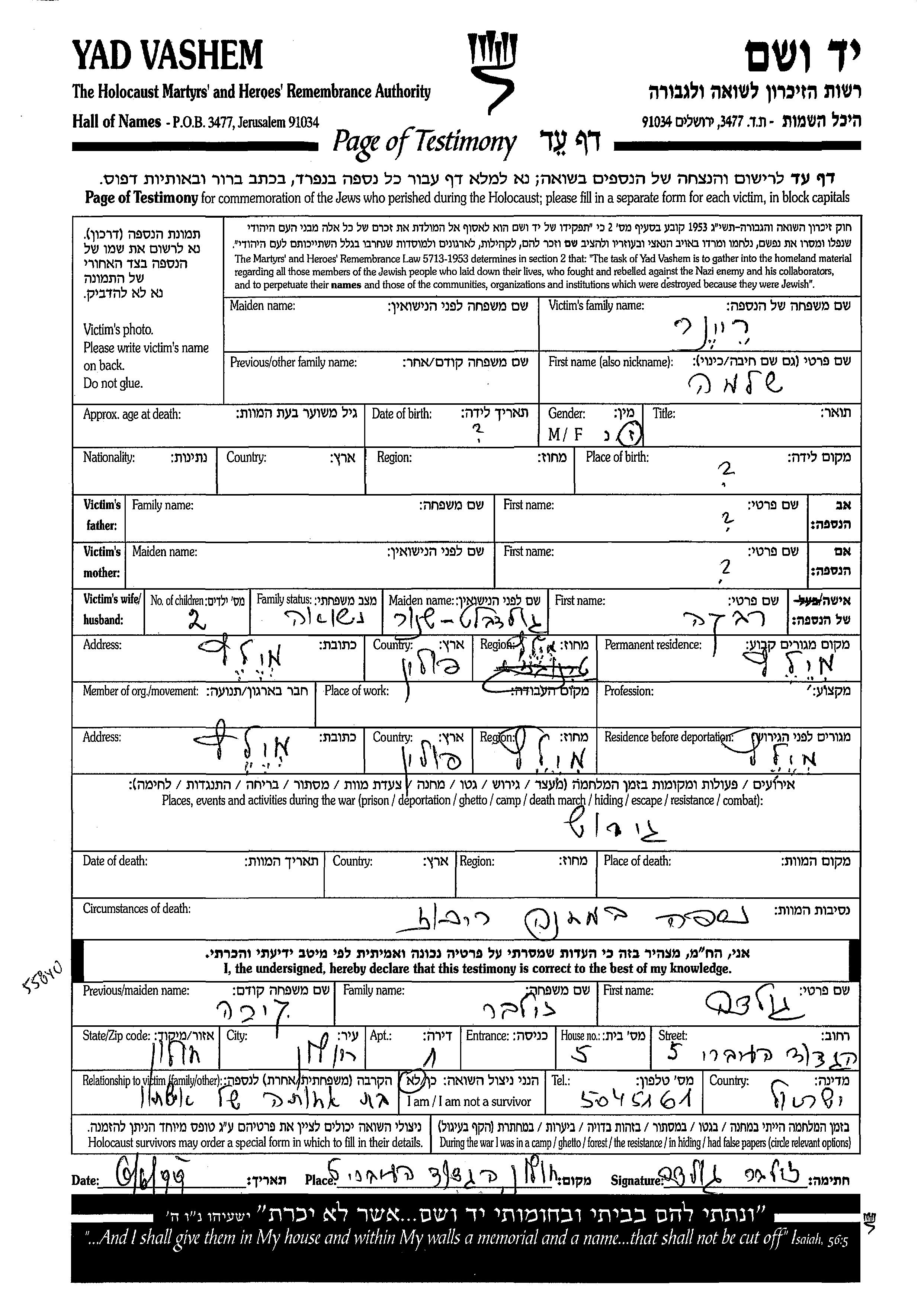 Aufenthaltsort während des Krieges/Schoah