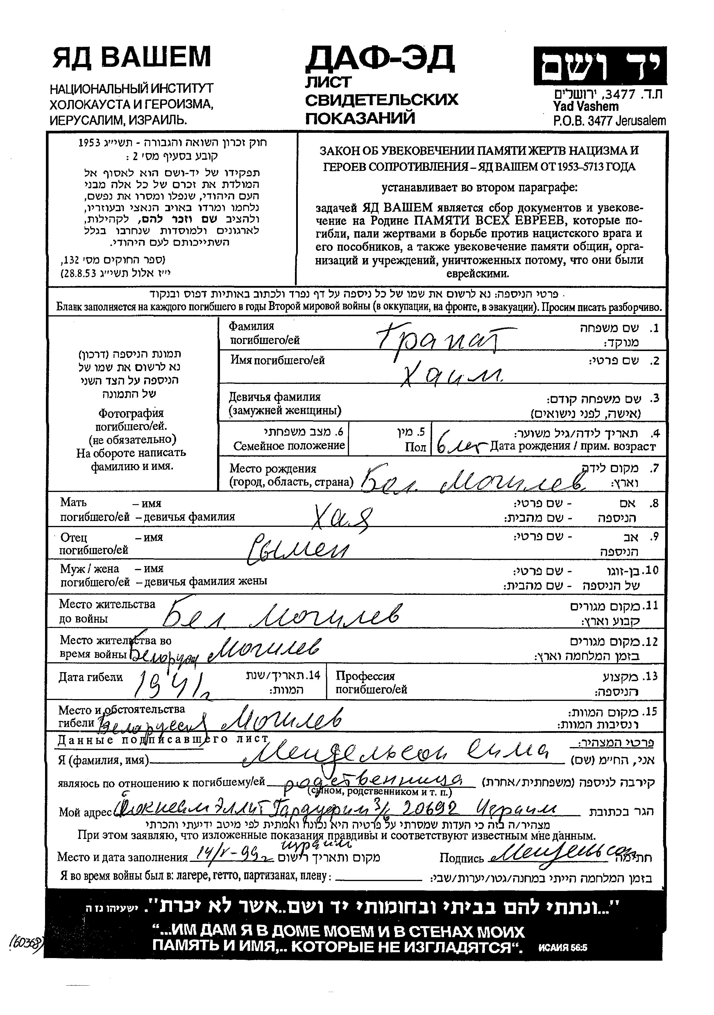 Khaim wurde in der Schoah ermordet. Todesort: Mogilev, Weißrussland (UdSSR) im Jahr 1941.